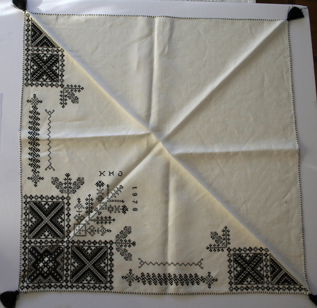 Geometriskt mönster i kvadrater i hörnen, två bårder mellan kvadraterna på ryggsnibb och framsnibbar varav en med svastikaliknande mönster. På ryggsnibben tre kvadrater och en majstångsspira samt märkning med årtal och initialer. På varje framsnibb en kvadrat och en trekant.