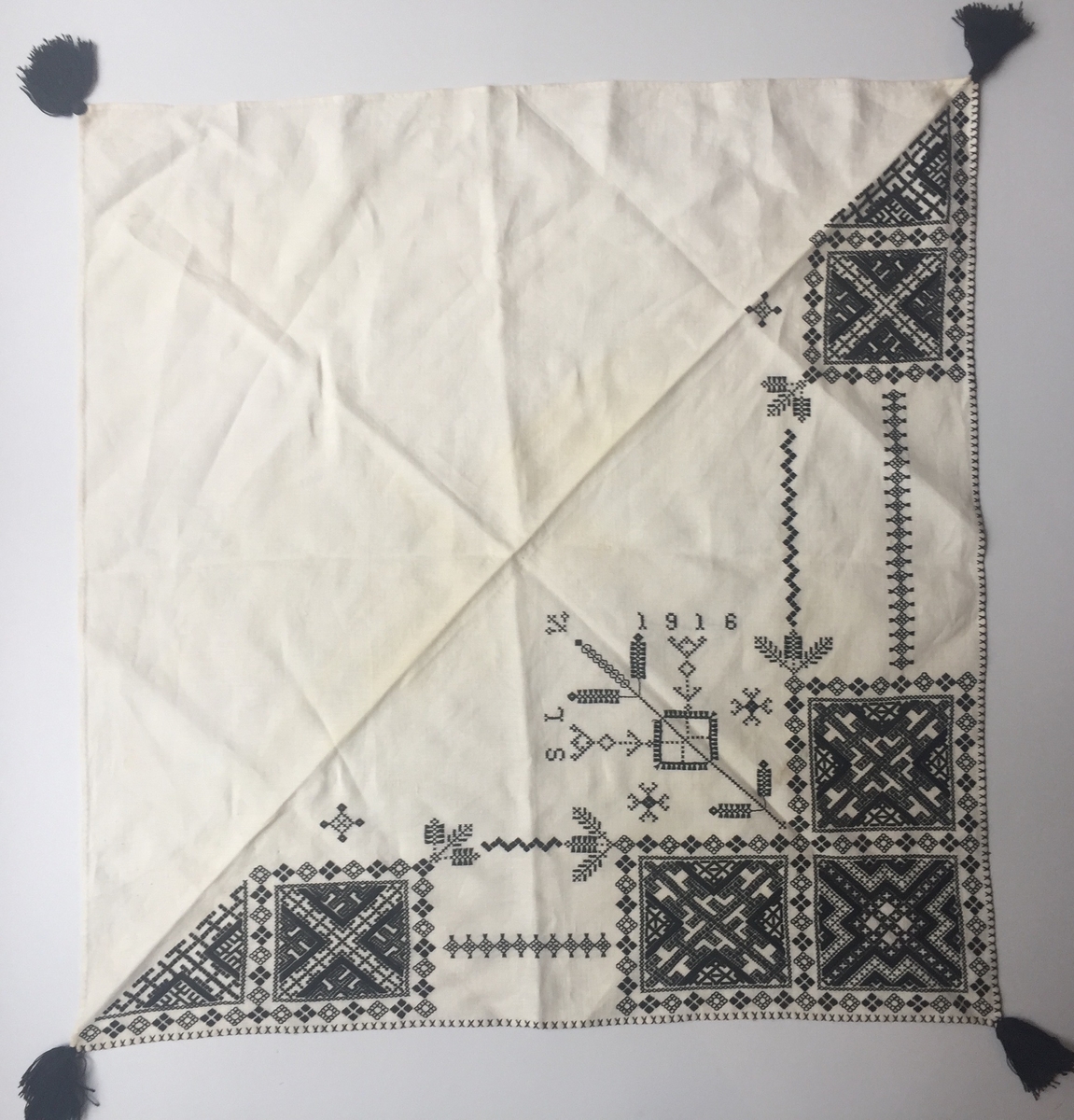 Geometriskt mönster i kvadrater i hörnen huvudsakligen i rätlinjig plattsöm. Två bårder mellan kvadraterna på ryggsnibb och framsnibbar. På ryggsnibben tre kvadrater och en majstångsspira samt märkning med årtal och initialer. På varje framsnibb en kvadrat och en trekant. Fem ornament