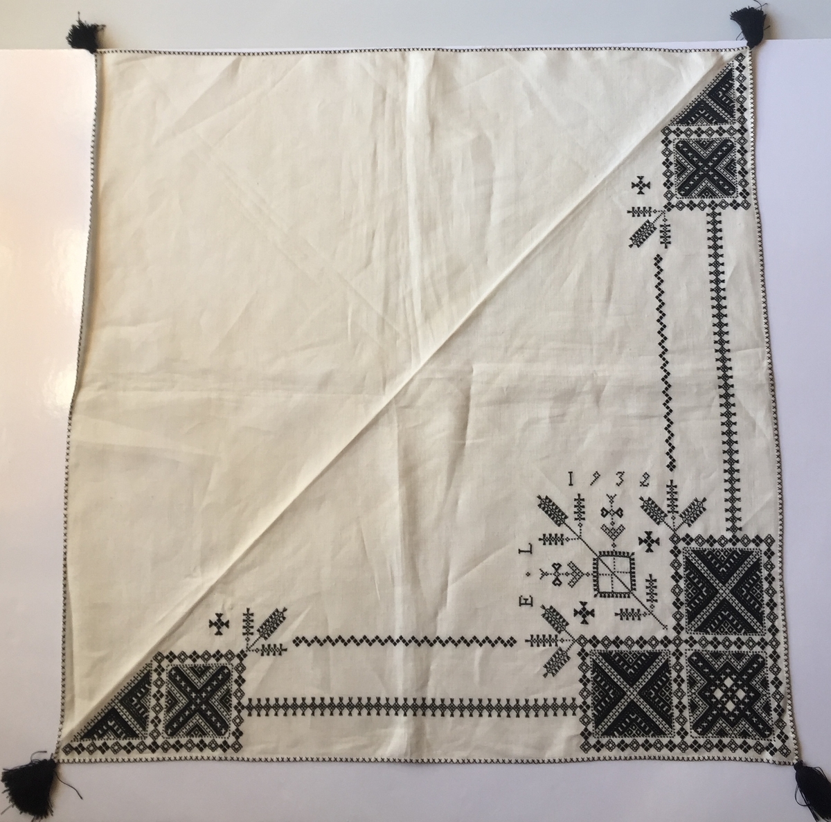 Geometriskt mönster i kvadrater i hörnen, två bårder mellan kvadraterna på ryggsnibb och framsnibbar. På ryggsnibben tre kvadrater och en majstångsspira samt märkning med årtal och initialer. På varje framsnibb en kvadrat och en trekant Fyra ornament.
