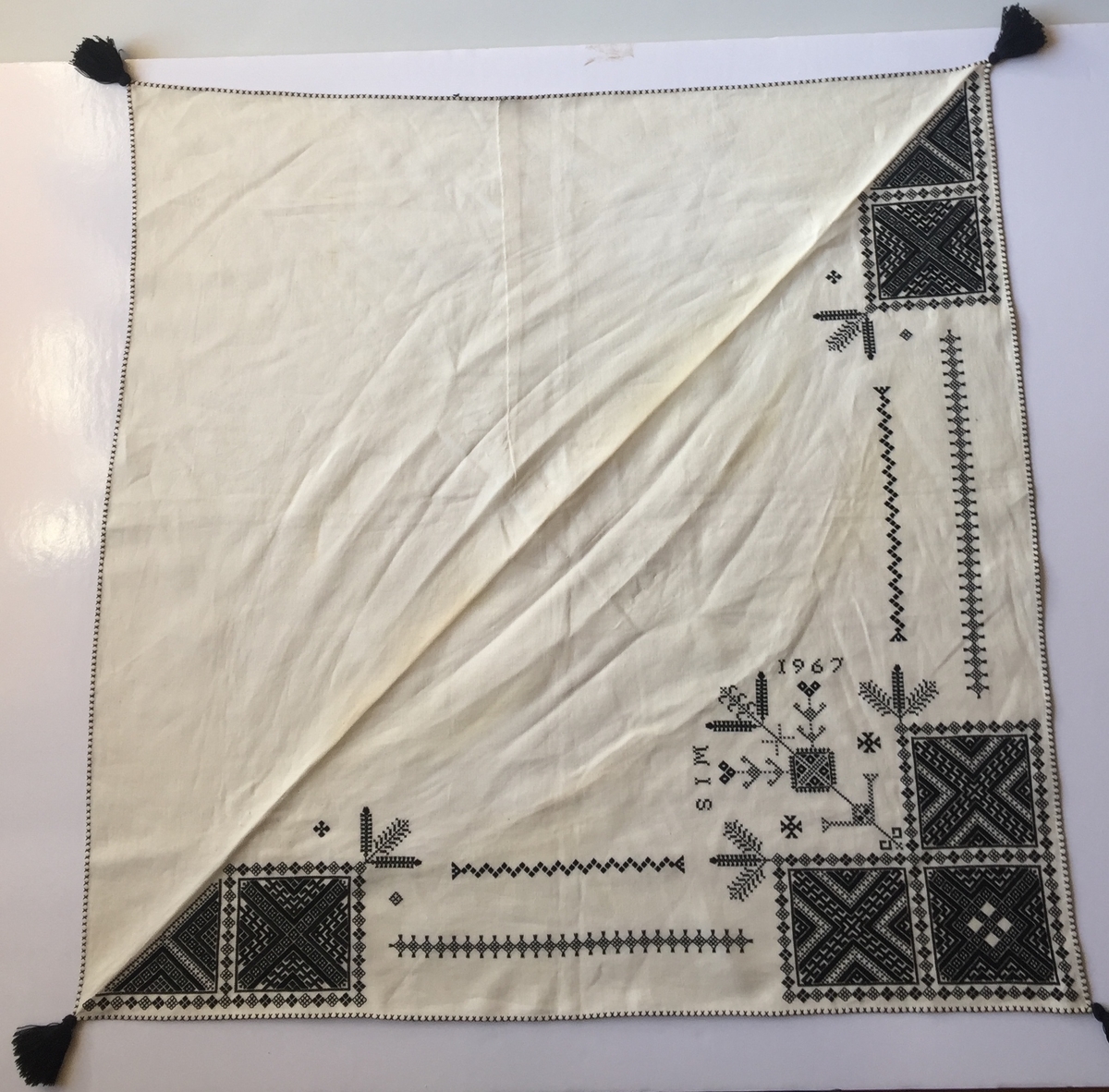 Geometriskt mönster i kvadrater i hörnen, två bårder mellan kvadraterna på ryggsnibb och framsnibbar. På ryggsnibben tre kvadrater och en majstångsspira samt märkning med årtal och initialer. På varje framsnibb en kvadrat och en trekant. Sex ornament.