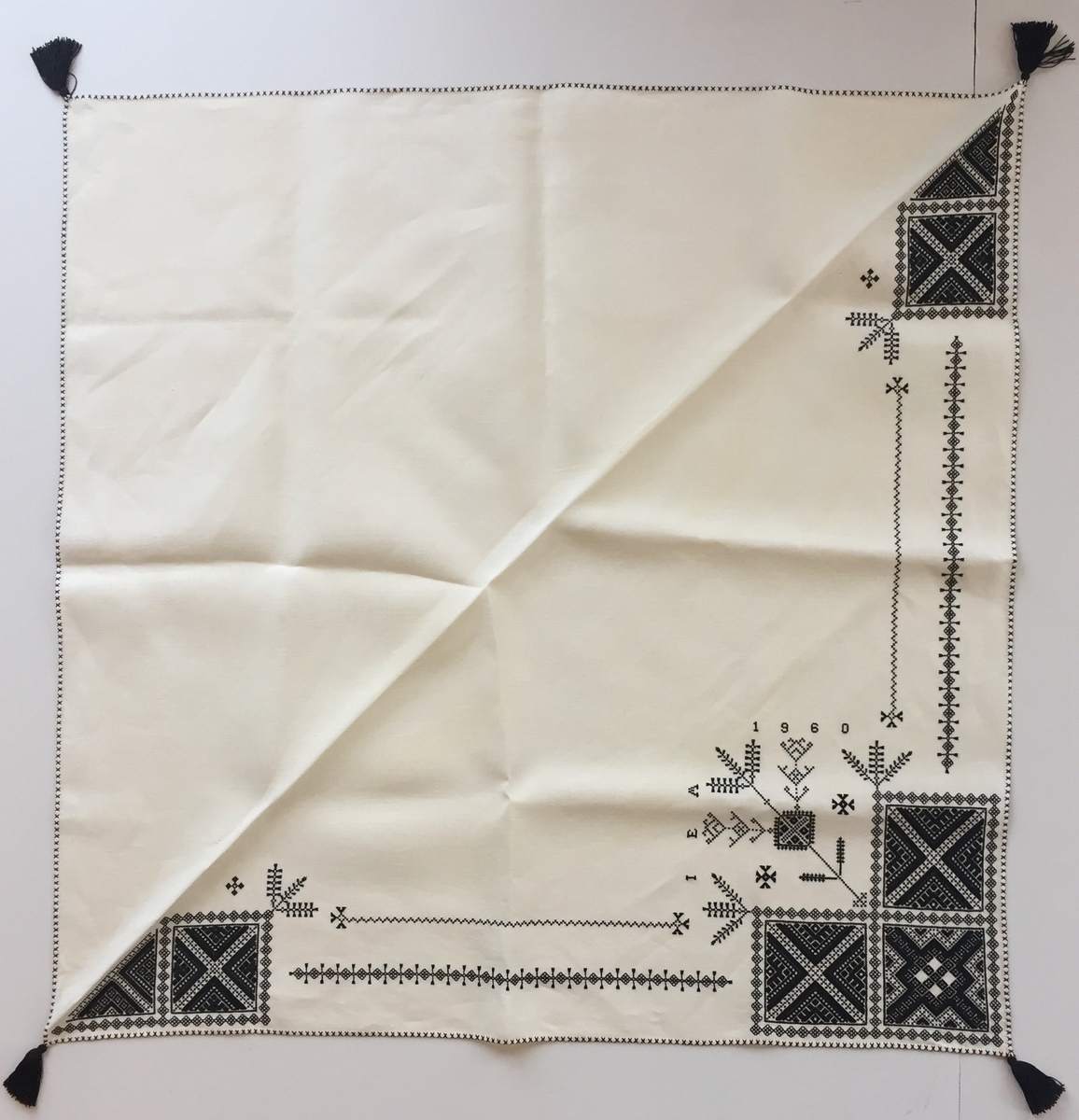 Geometriskt mönster i kvadrater i hörnen. Två bårder mellan kvadraterna på ryggsnibb och framsnibbar. På ryggsnibben tre kvadrater och en majstångsspira samt märkning med årtal och initialer. På varje framsnibb en kvadrat och en trekant. Fyra ornament