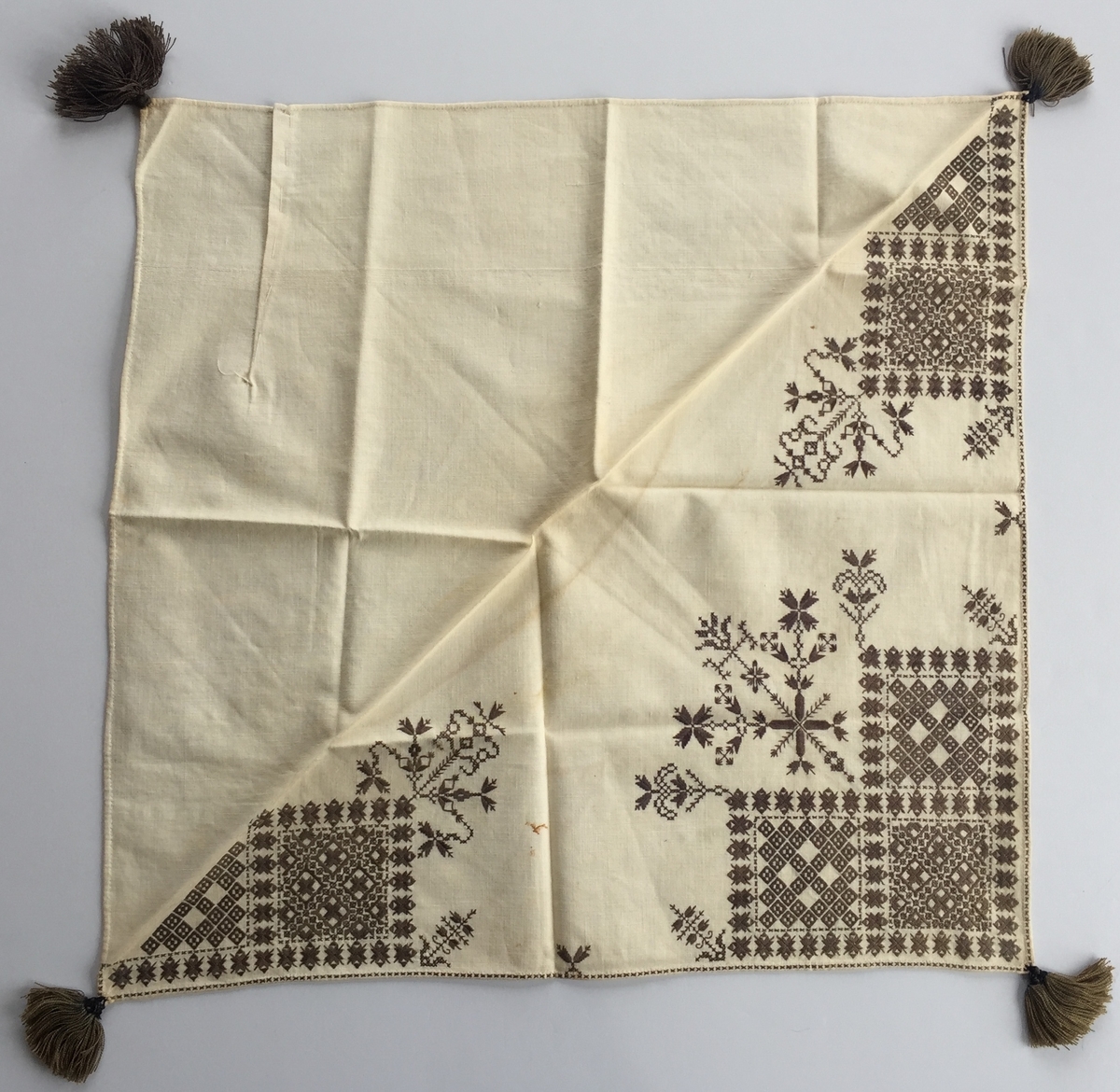 Blomsterinspirerat mönster i kvadrater i hörnen. Runt kvadraterna bård i blomstermotiv. Mellan kvadraterna på ryggsnibb och framsnibbar ett litet blomstermotiv. På ryggsnibben tre kvadrater och en dekorerad majstångsspira. På varje framsnibb en kvadrat och en trekant.