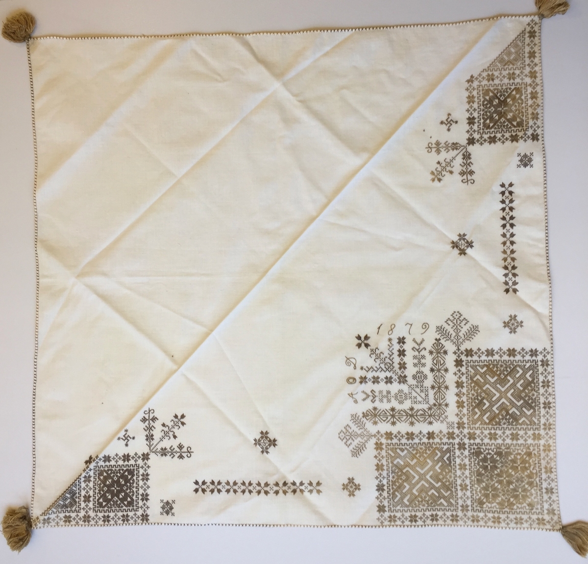 Geometriskt mönster i blomsterliknande former i kvadrater i hörnen, en bård mellan kvadraterna på ryggsnibb och framsnibbar. På ryggsnibben tre kvadrater och en majstångsspira (fyrkantig) samt märkning med årtal och initialer. På varje framsnibb och en kvadrat och en trekant.