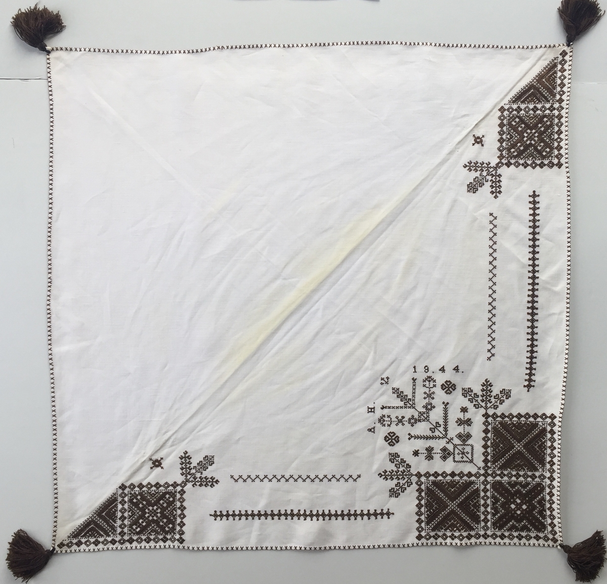 Geometriskt mönster i kvadrater i hörnen. Två bårder mellan kvadraterna på ryggsnibb och framsnibbar. På ryggsnibben tre kvadrater och en majstångsspira samt märkning med årtal och initialer. På varje framsnibb en kvadrat och en trekant. Fyra ornament