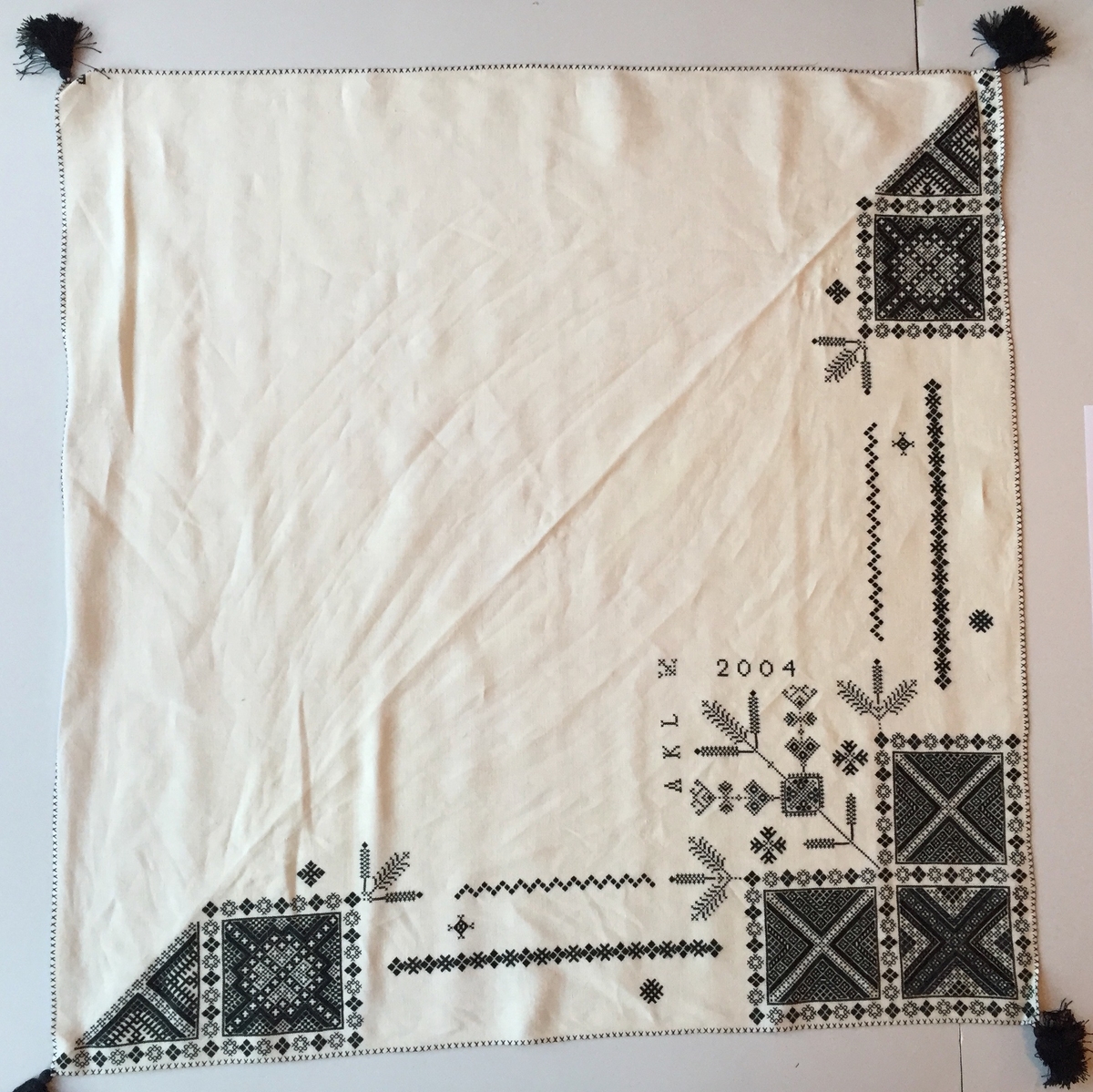 Geometriskt mönster i kvadrater i hörnen. Två bårder mellan kvadraterna på ryggsnibb och framsnibbar. På ryggsnibben tre kvadrater och en majstångsspira samt märkning med årtal och initialer. På varje framsnibb en kvadrat och en trekant. Nio ornament.