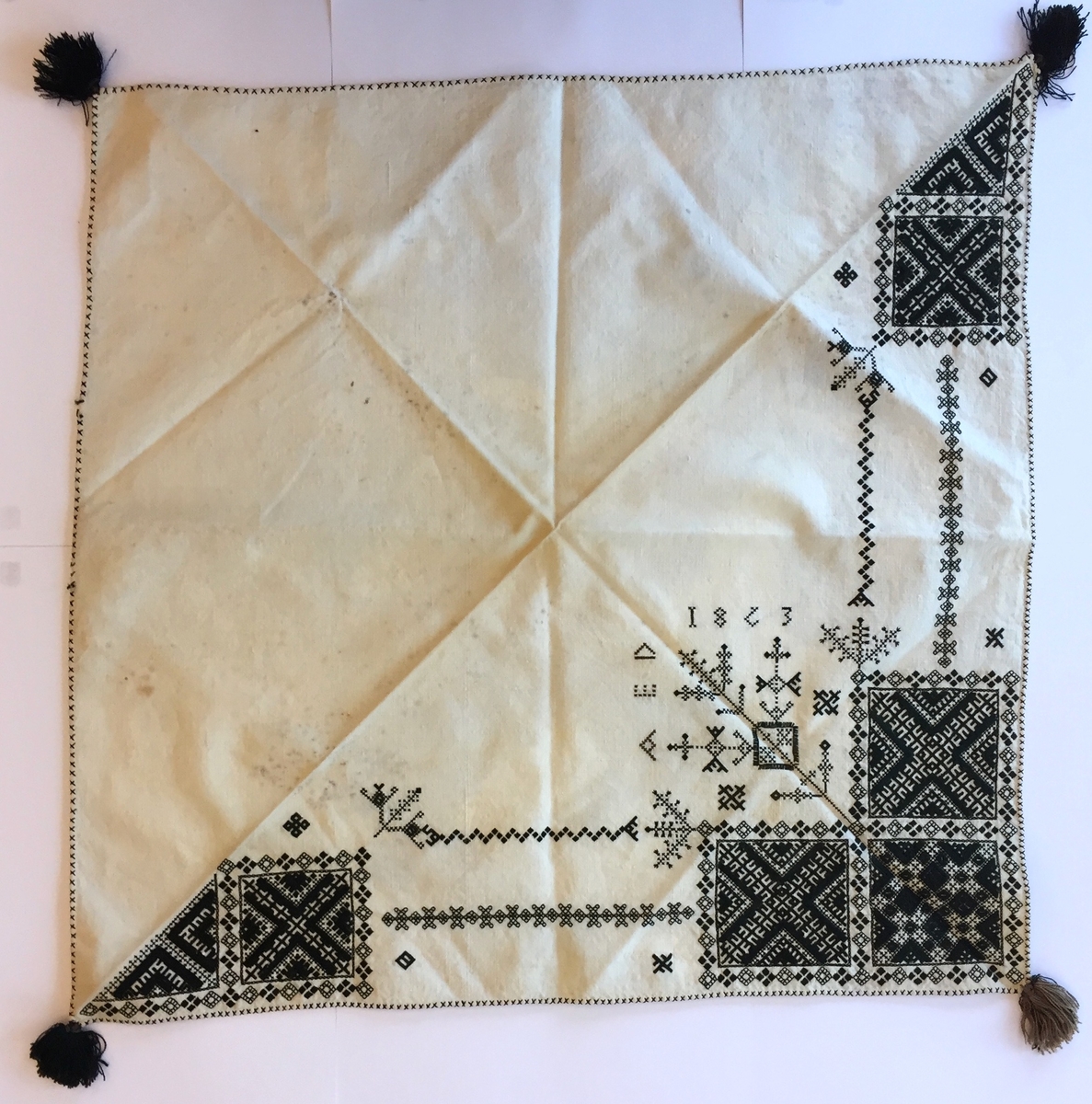 Geometriskt mönster i kvadrater i hörnen, bårder mellan kvadraterna på ryggsnibb och framsnibbar. På ryggsnibben tre kvadrater och en majstångsspira samt märkning med årtal och initialer. På varje framsnibb en kvadrat och en trekant.