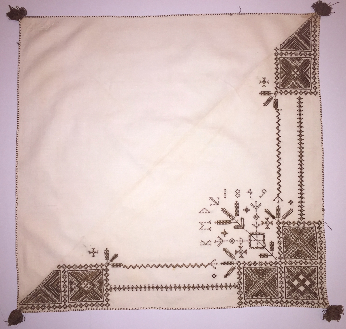 Geometriskt mönster i kvadrater i hörnen. Två bårder mellan kvadraterna på ryggsnibb och framsnibbar. På ryggsnibben tre kvadrater och en majstångsspira samt märkning med årtal och initialer. På varje framsnibb en kvadrat och en trekant. Nio ortnament.