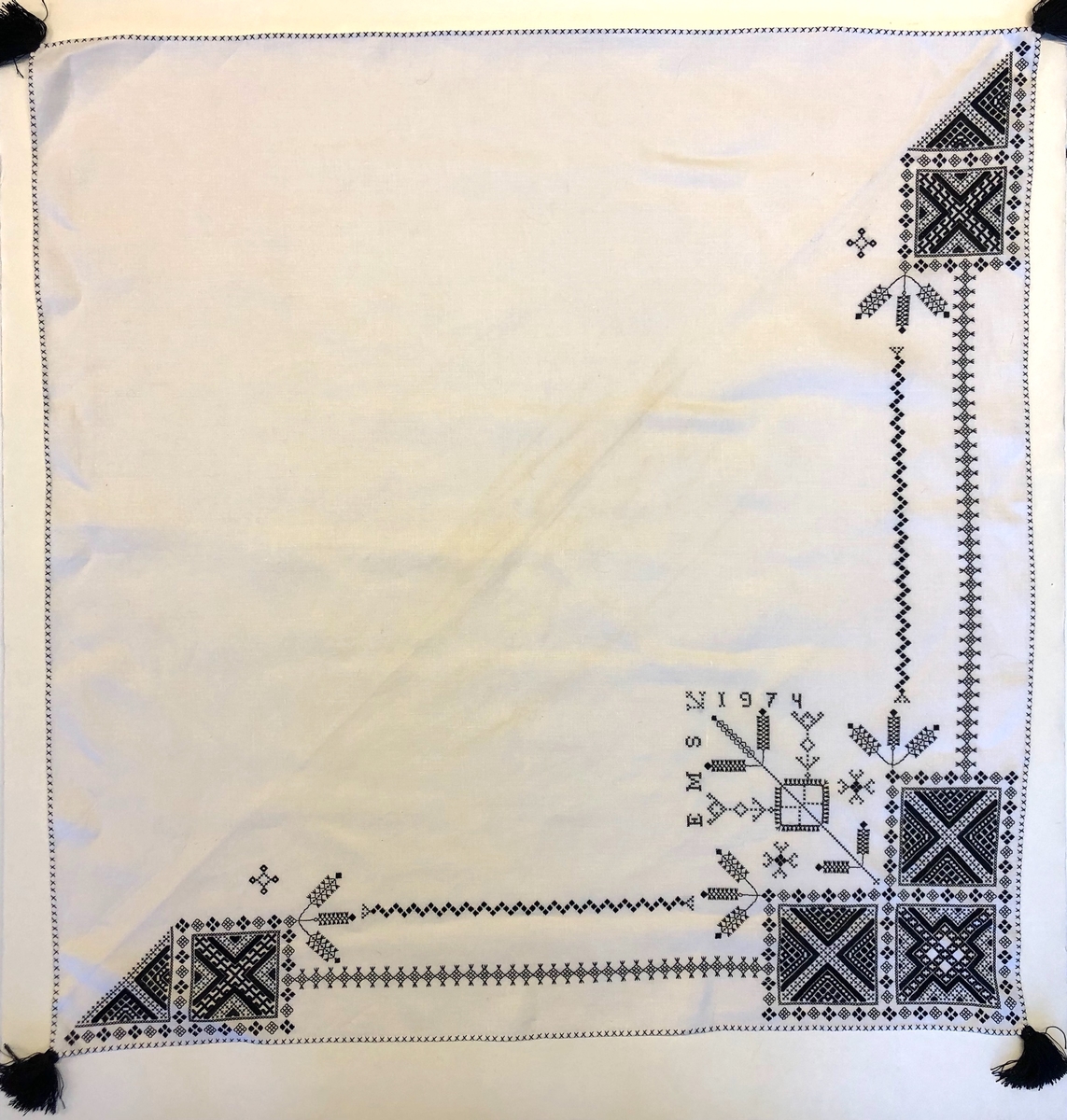 Titel: Geometriskt mönster i kvadrater i hörnen. Två bårder mellan kvadraterna på ryggsnibb och framsnibbar. På ryggsnibben tre kvadrater och en majstångsspira samt märkning med årtal och initialer. På varje framsnibb en kvadrat och en trekant. Fem ornament