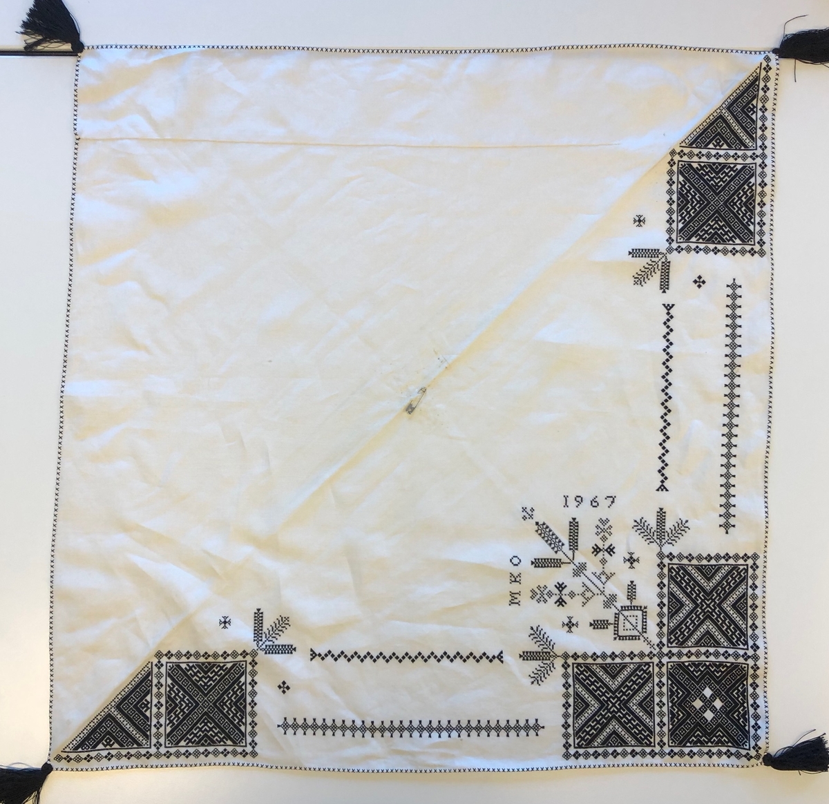 Geometriskt mönster i huvudsak i rätlinjig plattsöm i kvadrater i hörnen. Två bårder mellan kvadraterna på ryggsnibb och framsnibbar. På ryggsnibben tre kvadrater och en majstångsspira samt märkning med årtal och initialer. På varje framsnibb en kvadrat och en trekant. Sju ornament