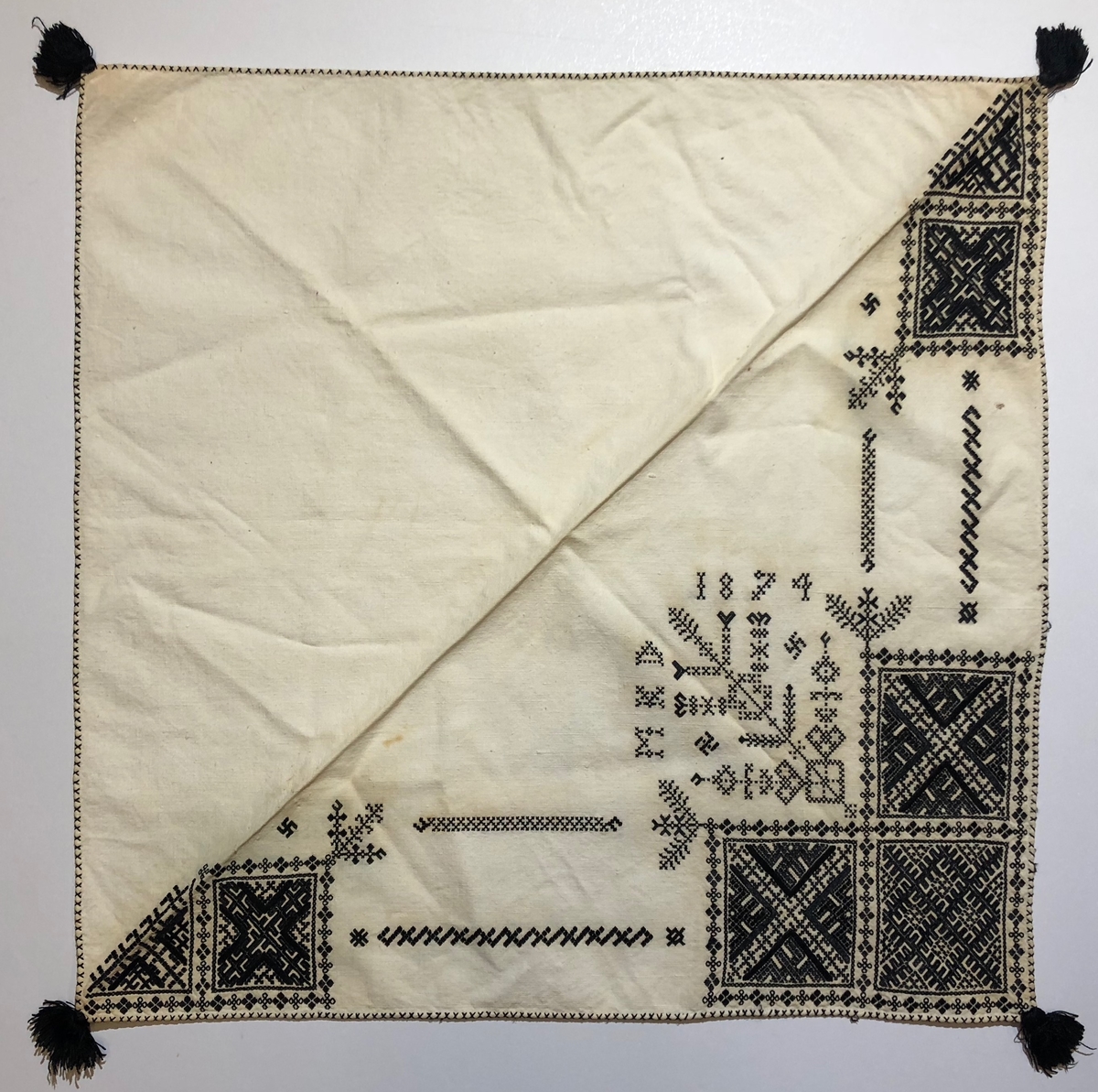 Geometriskt mönster i huvudsak i rätlinjig plattsöm i kvadrater i hörnen. Två bårder mellan kvadraterna på ryggsnibb och framsnibbar. På ryggsnibben tre kvadrater och en majstångsspira samt märkning med årtal och initialer. På varje framsnibb en kvadrat och en trekant. Åtta ornament
