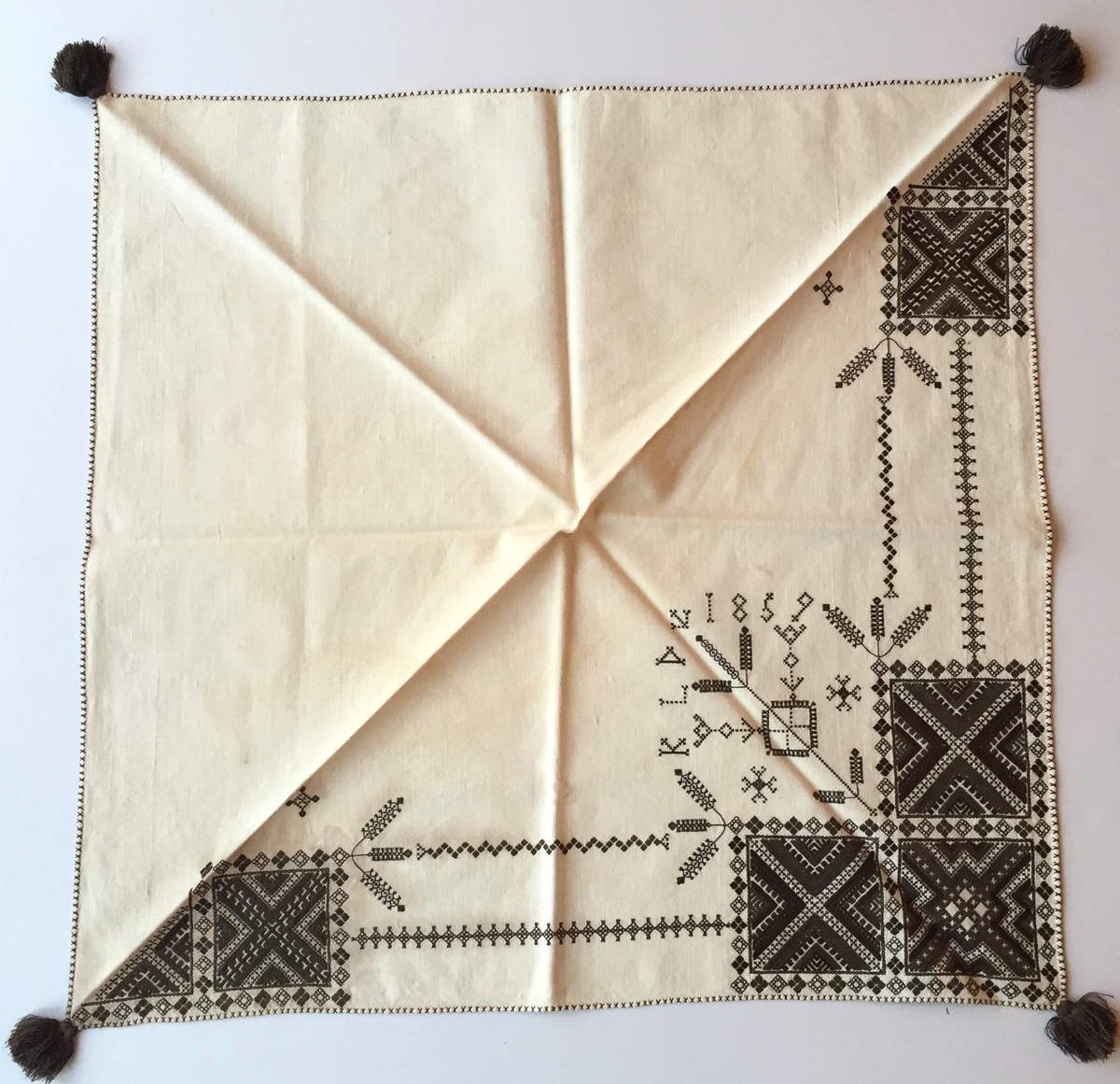 Geometriskt mönster i kvadrater i hörnen, huvudsakligen i plattsöm. Två bårder mellan kvadraterna på ryggsnibb och framsnibbar. På ryggsnibben tre kvadrater och en majstångsspira samt märkning med årtal och initialer. På varje framsnibb en kvadrat och en trekant. Fyra ornament.