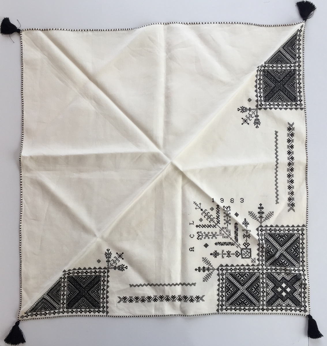 Geometriskt mönster i kvadrater i hörnen. Två bårder mellan kvadraterna på ryggsnibb och framsnibbar. På ryggsnibben tre kvadrater och en majstångsspira samt märkning med årtal och initialer. På varje framsnibb en kvadrat och en trekant. Sex ornament