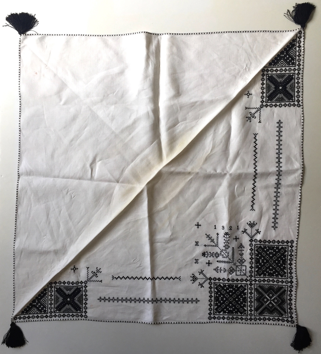 Geometriskt mönster i kvadrater i hörnen, bårder mellan kvadraterna på ryggsnibb och framsnibbar. På ryggsnibben tre kvadrater och en majstångsspira samt märkning med årtal och initialer. På varje framsnibb en kvadrat och en trekant. Ornament i korsstygn och plattsöm.