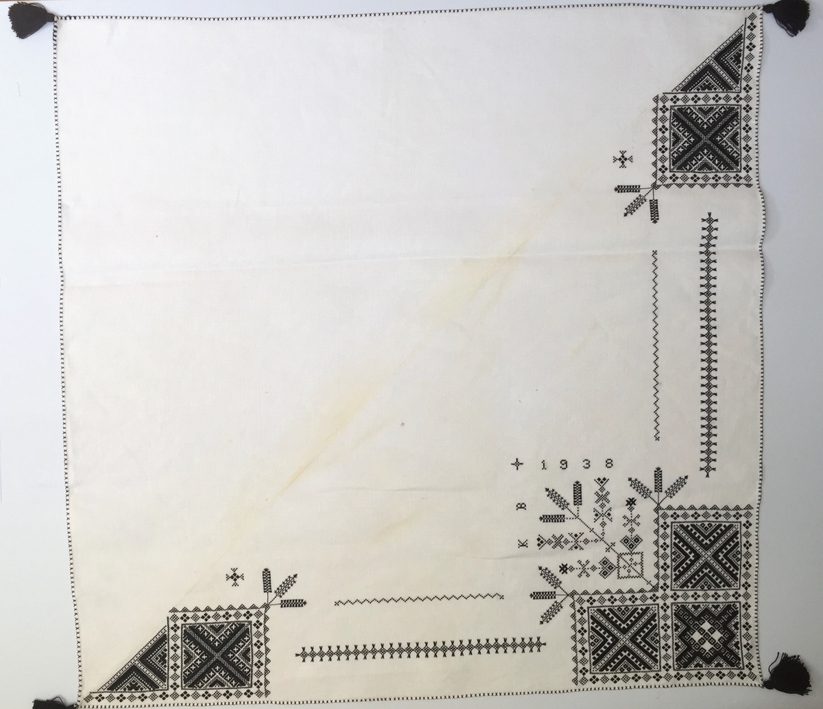 Geometriskt mönster i kvadrater i hörnen, bårder mellan kvadraterna på ryggsnibb och framsnibbar. På ryggsnibben tre kvadrater och en majstångsspira i korsstygn samt märkning med årtal och initialer. PÅ varje framsnibb en kvadrat och en trekant.