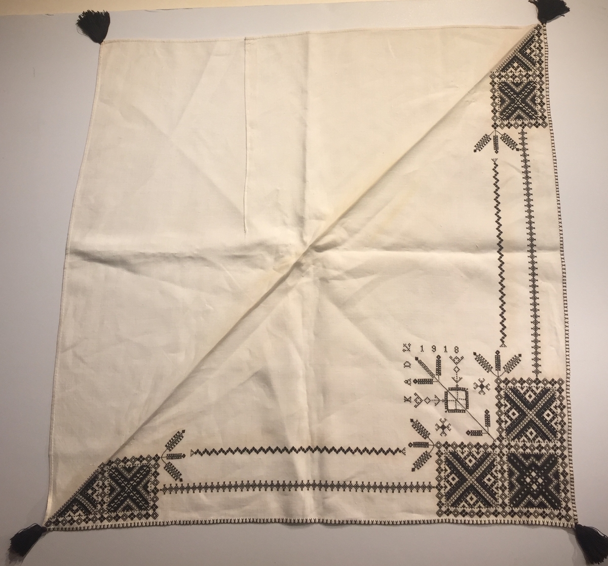 Geometriskt mönster i kvadrater i hörnen. Två bårder mellan kvadraterna på ryggsnibb och framsnibbar. På ryggsnibben tre kvadrater och en majstångsspira samt märkning med