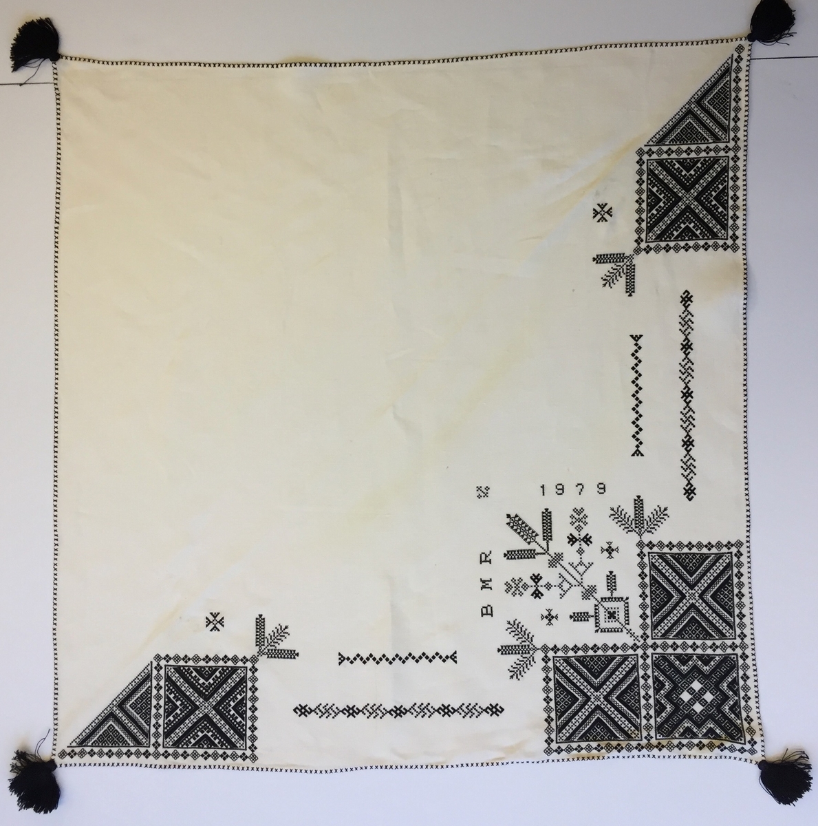 Titel: Geometriskt mönster i kvadrater i hörnen, två bårder mellan kvadraterna på ryggsnibb och framsnibbar. På ryggsnibben tre kvadrater och en majstångsspira samt märkning med årtal och initialer. På varje framsnibb en kvadrat och en trekant. Fem ornament.