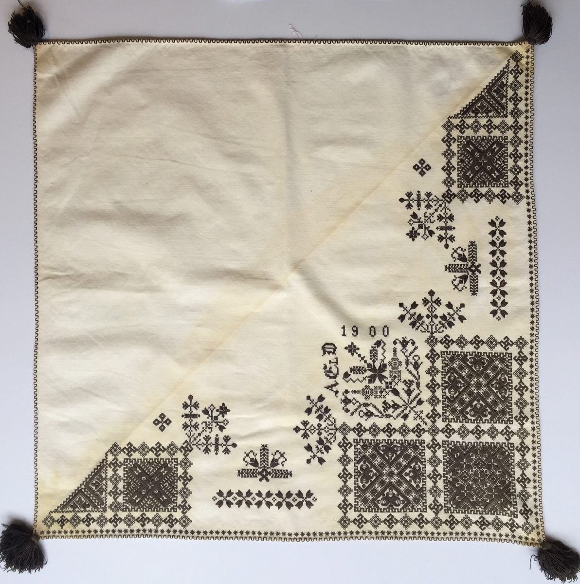 Blomfyllda kvadrater omgivna av bård med svastickaliknande former. Mellan kvadraterna på framsnibbar och ryggsnibb blombård, Fyrkantig spira på ryggsnibb och ytterligare fyra små spiror. Två ornament.