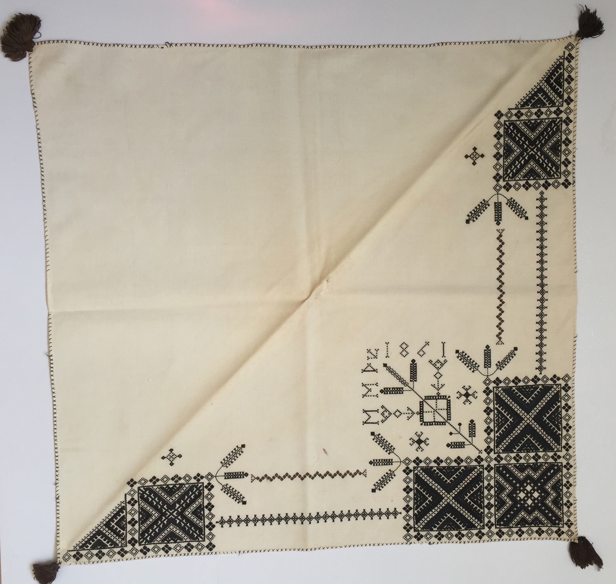 Geometriskt mönster i kvadrater i hörnen, bårder mellan kvadraterna på ryggsnibb och framsnibbar. På ryggsnibben tre kvadrater och en majstångsspira samt märkning med årtal och initialer. På varje framsnibb en kvadrat och en trekant. Ornament i korsstygn.