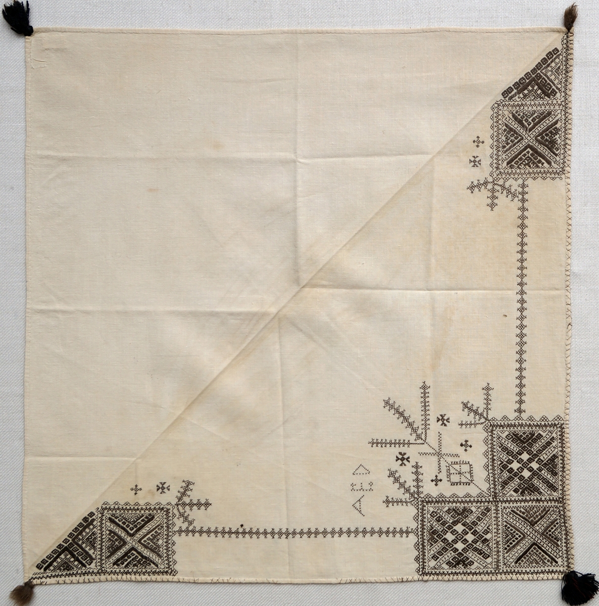 Geometrisk mönster i kvadrater i hörnen, bård mellan kvadraterna på ryggsnibb och framsnibbarna.