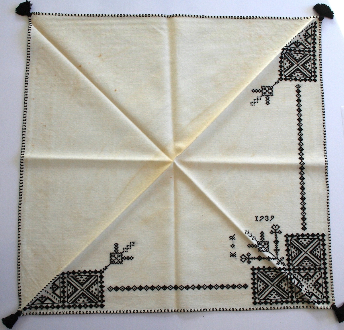 Geometriskt mönster i kvadrater i hörnen, en bård mellan kvadraterna på ryggsnibb och framsnibbar. På ryggsnibben tre kvadrater och en majstångsspira samt märkning med årtal och initialer. På varje framsnibb en kvadrat och en trekant. Enkla broderier.