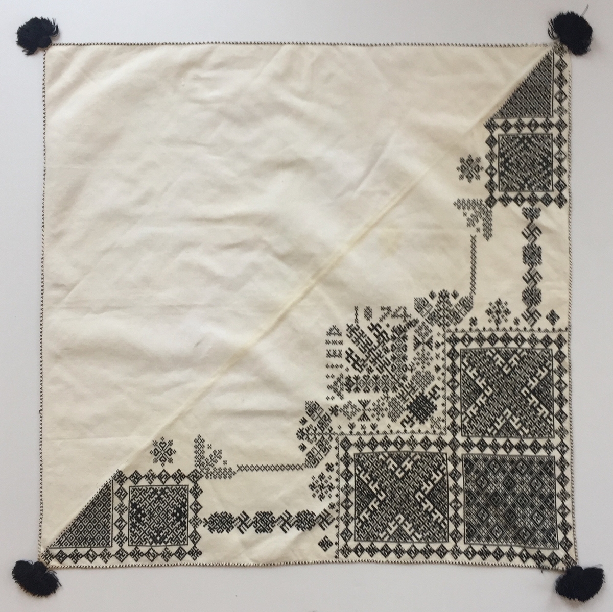 Geometriskt mönster i kvadrater i hörnen . Två bårder mellan kvadraterna på ryggsnibb och framsnibbar. På ryggsnibben tre kvadrater och en majstångsspira samt märkning med årtal och initialer. På varje framsnibb en kvadrat och en trekant. Tio ornament