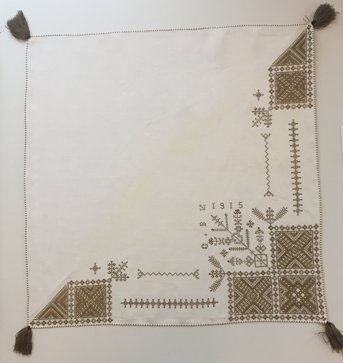 Titel: Geometriskt mönster i kvadrater i hörnen. Två bårder mellan kvadraterna på ryggsnibb och framsnibbar. På ryggsnibben tre kvadrater och en majstångsspira samt märkning med årtal och initialer. På varje framsnibb en kvadrat och en trekant. Fem ornament