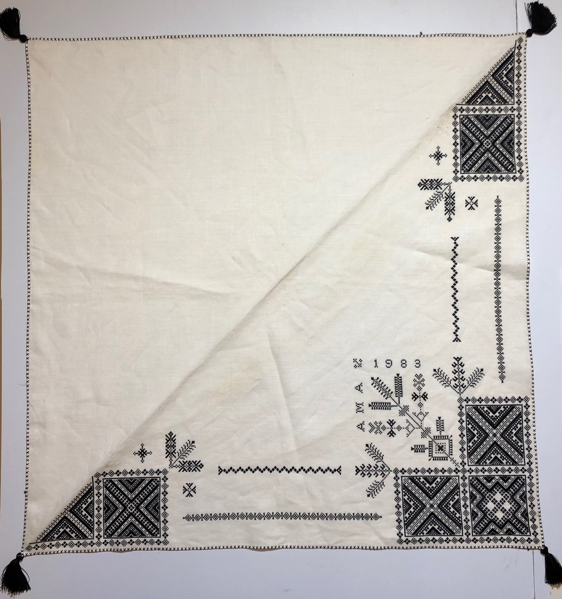 Geometriskt mönster i kvadrater i hörnen. Två bårder mellan kvadraterna på ryggsnibb och framsnibbar. På ryggsnibben tre kvadrater och en majstångsspira samt märkning med årtal och initialer. På varje framsnibb en kvadrat och en trekant. Fem ornament