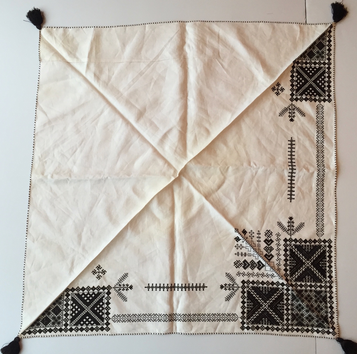 Geometriskt mönster i kvadrater i hörnen, i huvudsak i rätlinjig plattsöm. Två bårder mellan kvadraterna på ryggsnibb och framsnibbar. På ryggsnibben tre kvadrater och en kvadratisk majstångsspira. På varje framsnibb en kvadrat och en trekant. Två ornament.