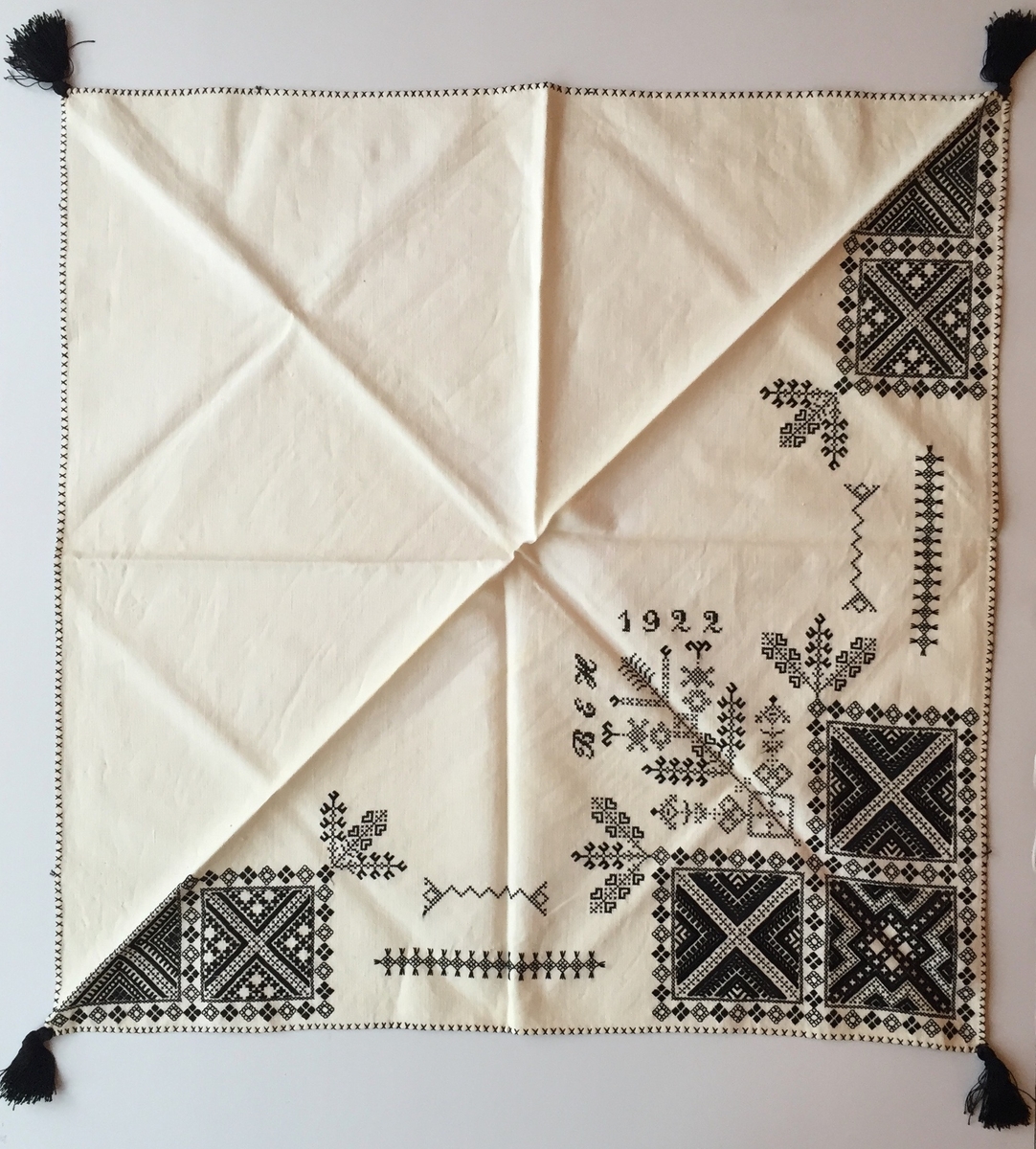 Geometriskt mönster i kvadrater i hörnen. Två bårder mellan kvadraterna på ryggsnibb och framsnibbar. På ryggsnibben tre kvadrater och en dekorerad majstångsspira samt märkning med årtal och initialer. På varje framsnibb en kvadrat och en trekant.