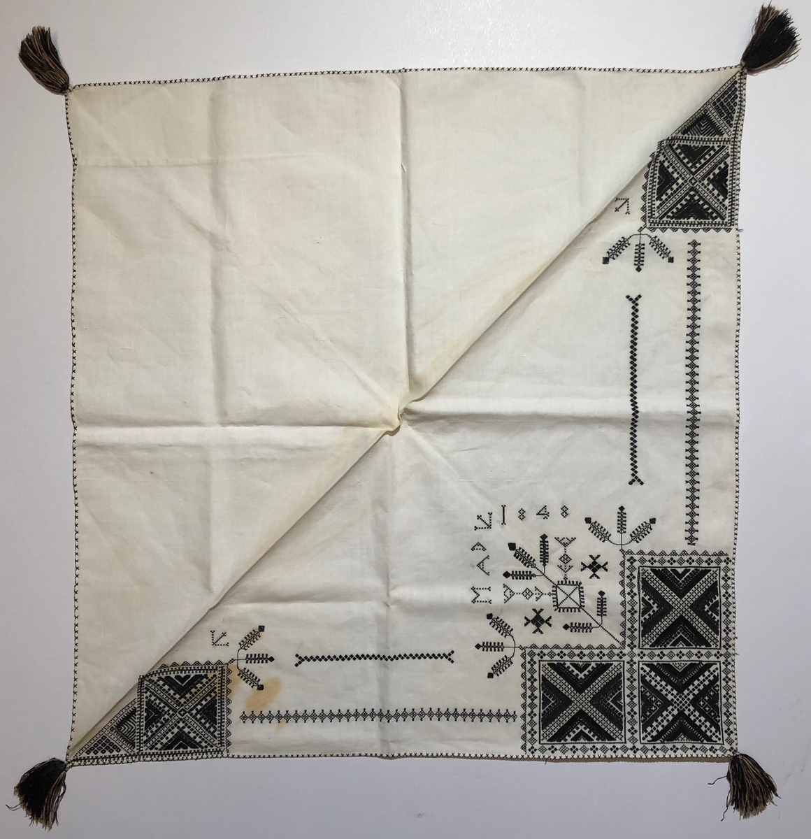 Geometriskt mönster i kvadrater i hörnen. Två bårder mellan kvadraterna på ryggsnibb och framsnibbar. På ryggsnibben tre kvadrater och en majstångsspira samt märkning med årtal och initialer. På varje framsnibb en kvadrat och en trekant. Fem ornament
