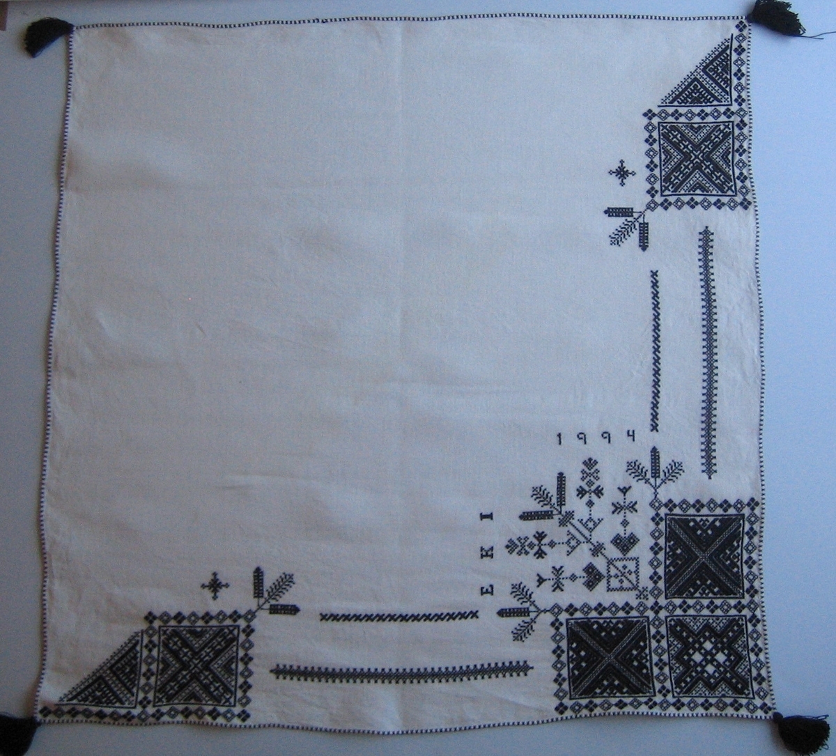 Geometriskt mönster i kvadrater i hörnen. Två bårder mellan kvadraterna på ryggsnibb och framsnibbar. På ryggsnibben tre kvadrater och en majstångsspira samt märkning med årtal och initialer. På varje framsnibb en kvadrat och en trekant. Två ornament.