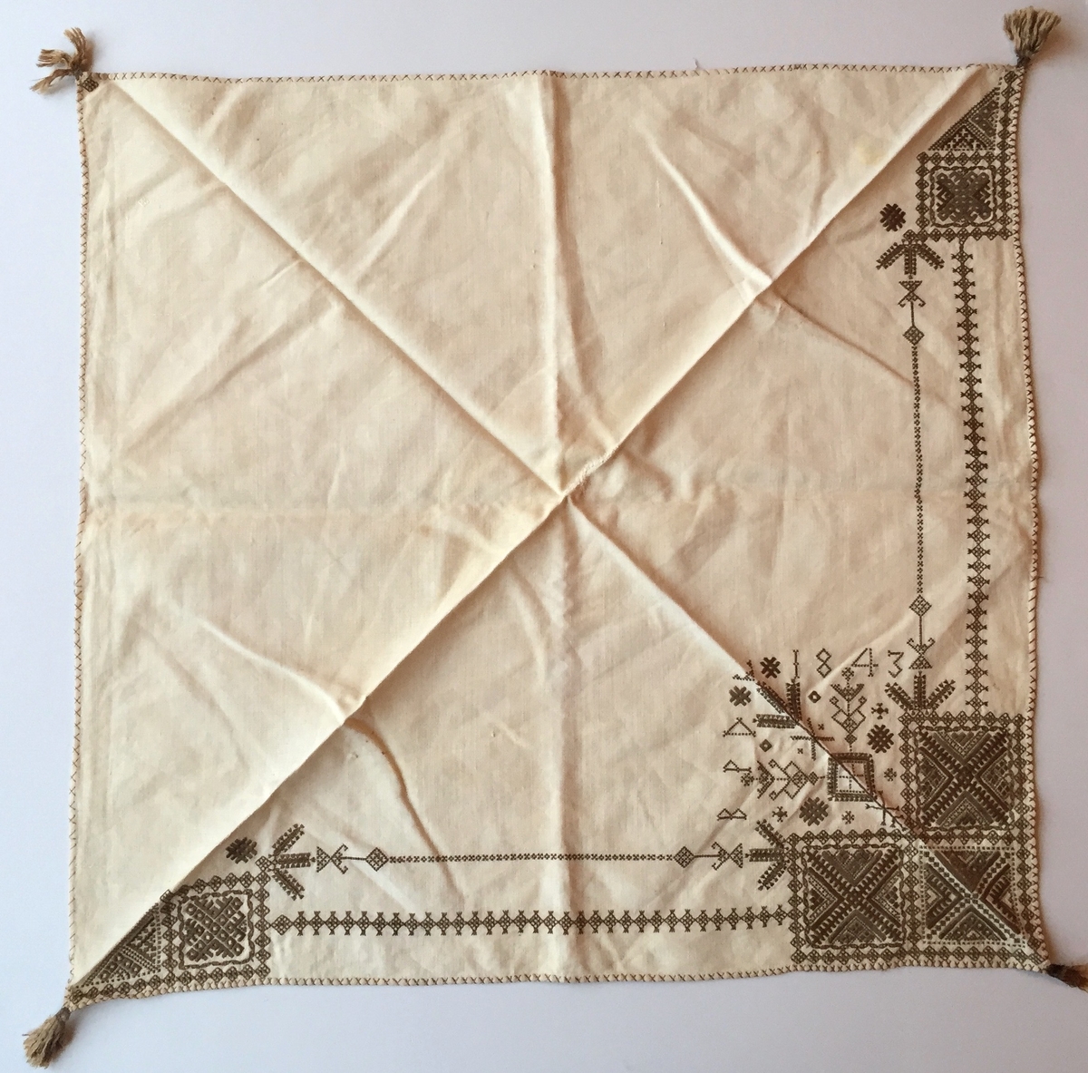 Geometriskt mönster i kvadrater i hörnen. Två bårder mellan kvadraterna på ryggsnibb och framsnibbar. På ryggsnibben tre kvadrater och en majstångsspira samt märkning med årtal och initialer. På varje framsnibb en kvadrat och en trekant. Två ornament.