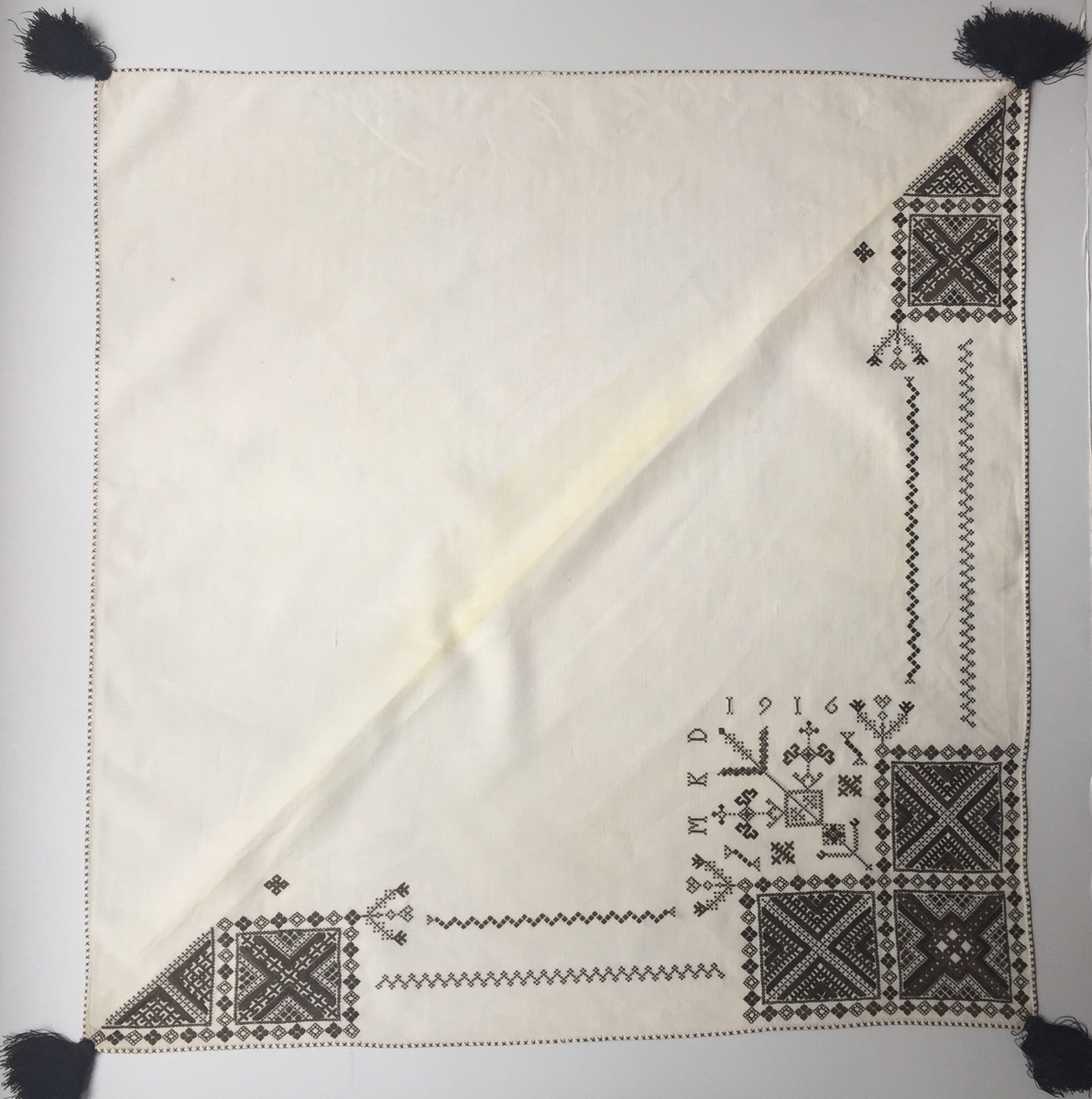 Geometriskt mönster i kvadrater i hörnen. Två bårder mellan kvadraterna på ryggsnibb och framsnibbar. På ryggsnibben tre kvadrater och en majstångsspira samt märkning med årtal och initialer. På varje framsnibb en kvadrat och en trekant. Sex ornament