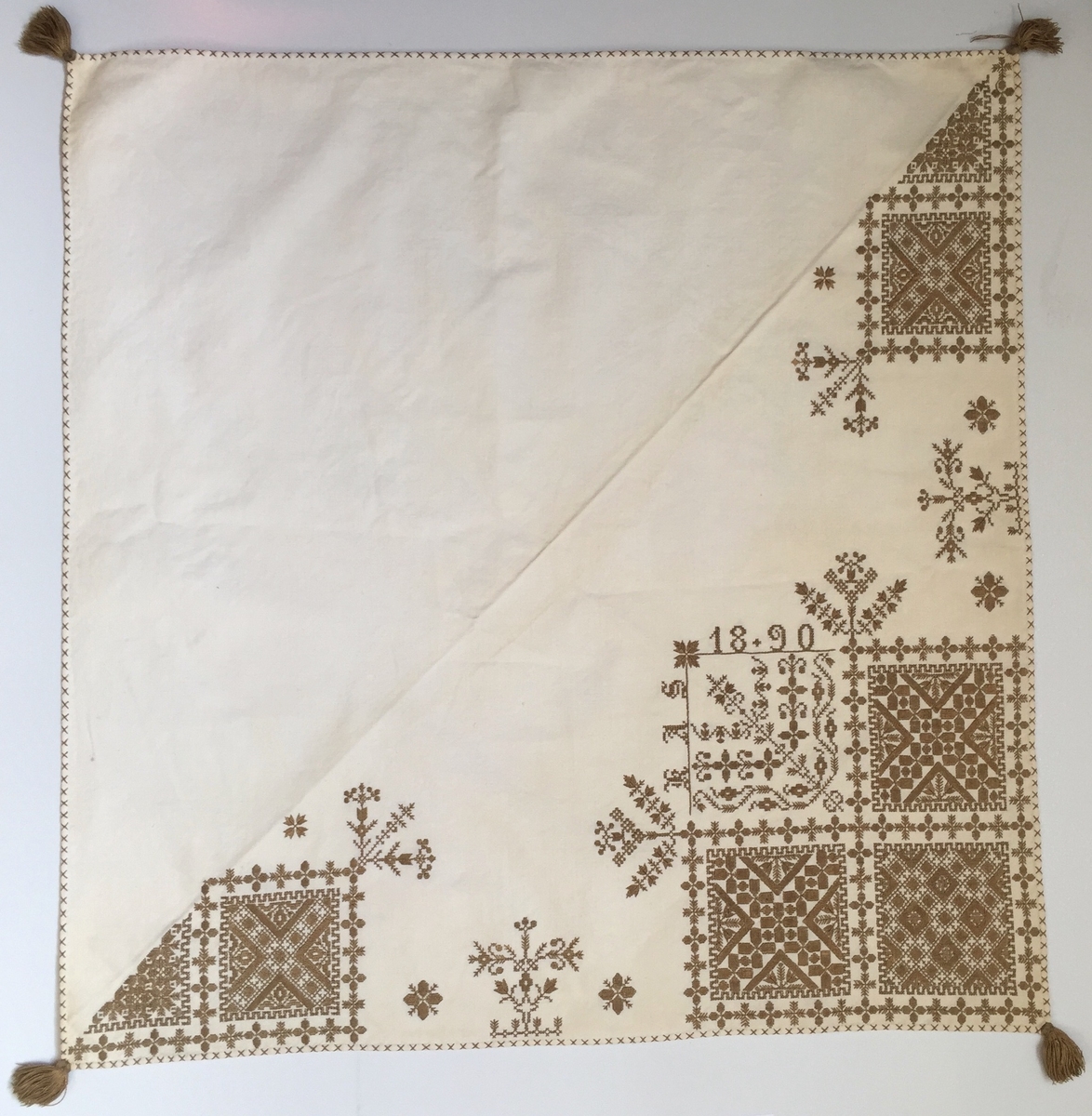 Geometriskt mönster i kvadrater i hörnen på ryggsnibb och framsnibbar. Majstångsspira med blomstermönster. Mellan ryggsnibb och framsnibbar blomsterkorgsliknande mönster i plattsöm. Ornament blomsterliknande i plattsöm