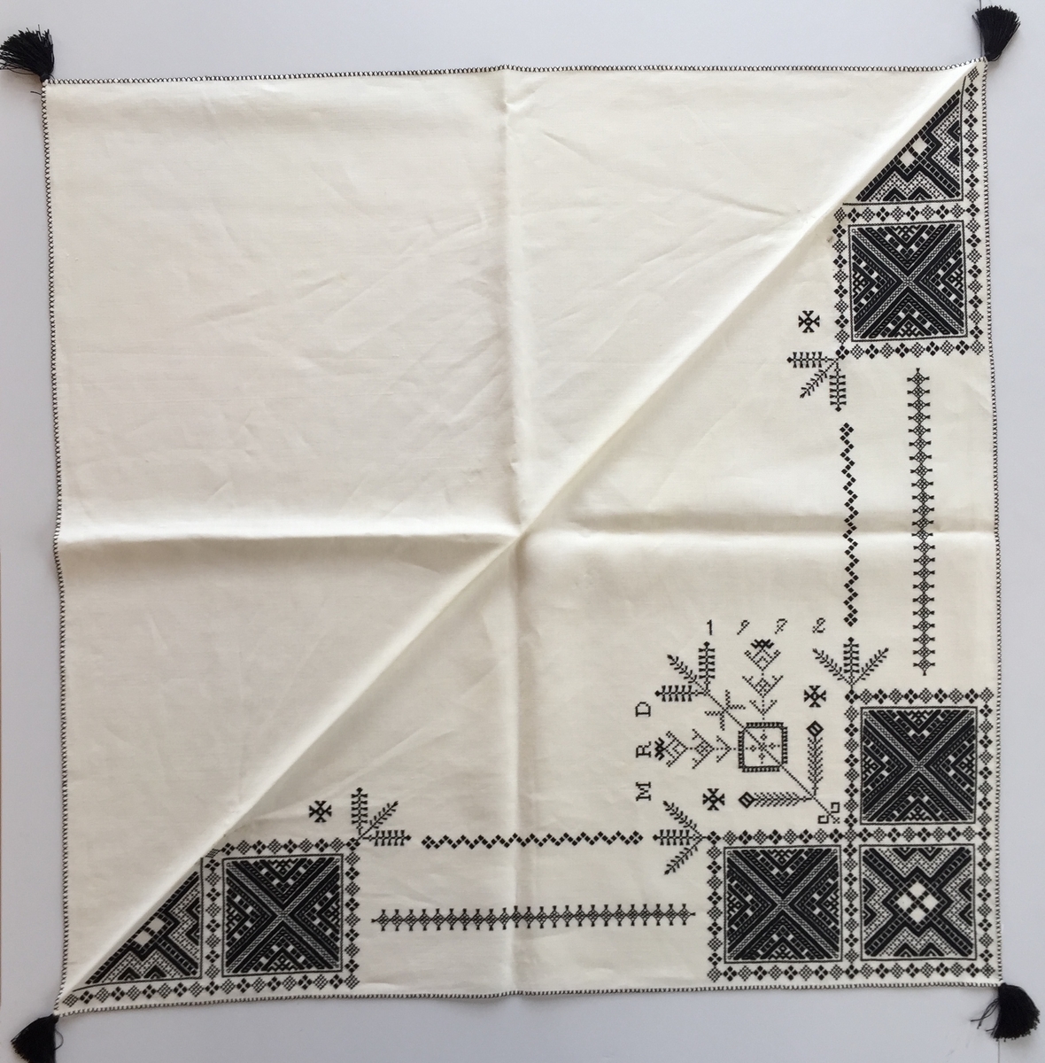 Geometriskt mönster i kvadrater i hörnen. Två bårder mellan kvadraterna på ryggsnibb och framsnibbar. På ryggsnibben tre kvadrater och en majstångsspira samt märkning med årtal och initialer. På varje framsnibb en kvadrat och en trekant. Fyra ornament