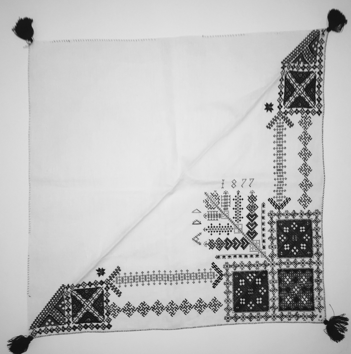 Geometriskt mönster i kvadrater i hörnen, huvudsakligen i rätlinjig plattsöm. Två bårder mellan kvadraterna på ryggsnibb och framsnibbar. På ryggsnibben tre kvadrater och en majstångsspira samt märkning med årtal och initialer. På varje framsnibb en kvadrat och en trekant. Två ornament