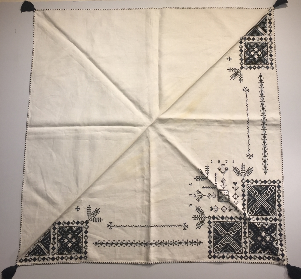 Geometriskt mönster i kvadrater i hörnen. Två bårder mellan kvadraterna på ryggsnibb och framsnibbar. På ryggsnibben tre kvadrater och en rikt dekorerad majstångsspira samt märkning med årtal och initialer. På varje framsnibb en kvadrat och en trekant. Två ornament.