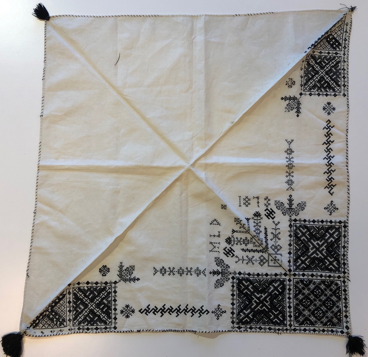 Geometriskt mönster i huvudsak i rätlinjig plattsöm i kvadrater i hörnen. Två bårder mellan kvadraterna på ryggsnibb och framsnibbar. På ryggsnibben tre kvadrater och en majstångsspira samt märkning med årtal och initialer. På varje framsnibb en kvadrat och en trekant. Sju ornament