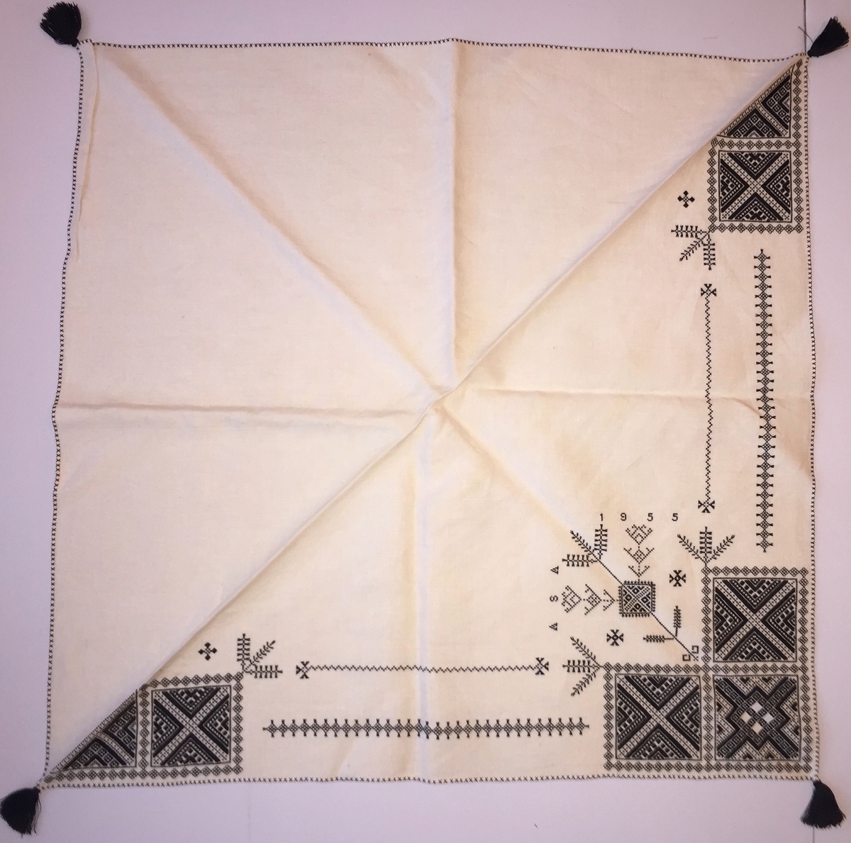 Geometriskt mönster i kvadrater i hörnen. Två bårder mellan kvadraterna på ryggsnibb och framsnibbar. På ryggsnibben tre kvadrater och en dekorerad majstångsspira samt märkning med årtal och initialer. På varje framsnibb en kvadrat och en trekant. Fyra ortnament.