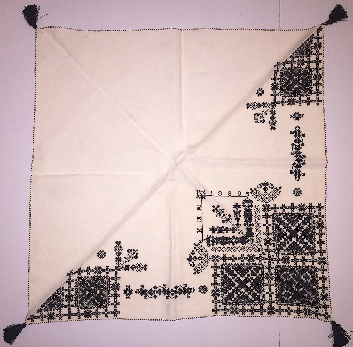 Blomsterinspirerat mönster i kvadrater i hörnen. Runt kvadraterna bård i blomstermotiv. Mellan kvadraterna på ryggsnibb och framsnibbar en blomsterliknande bård. På ryggsnibben tre kvadrater och en fyrkantig majstångsspira samt märkning med årtal och initialer. På varje framsnibb en kvadrat och en trekant. Sex ornament.