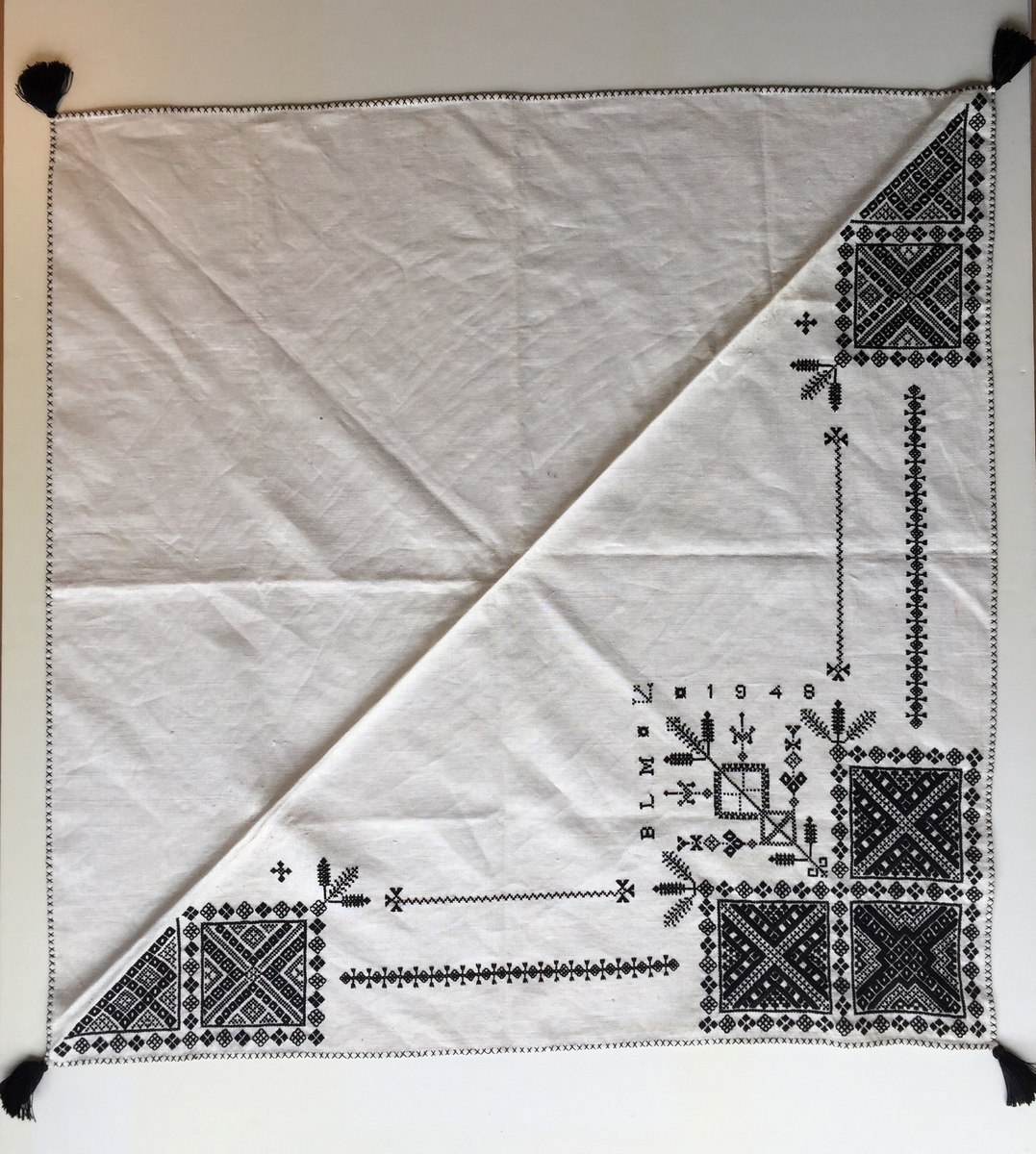 Titel: Geometriskt mönster i kvadrater i hörnen, två bårder mellan kvadraterna på ryggsnibb och framsnibbar. På ryggsnibben tre kvadrater och en majstångsspira samt märkning med årtal och initialer. På varje framsnibb en kvadrat och en trekant. Två ornament.
