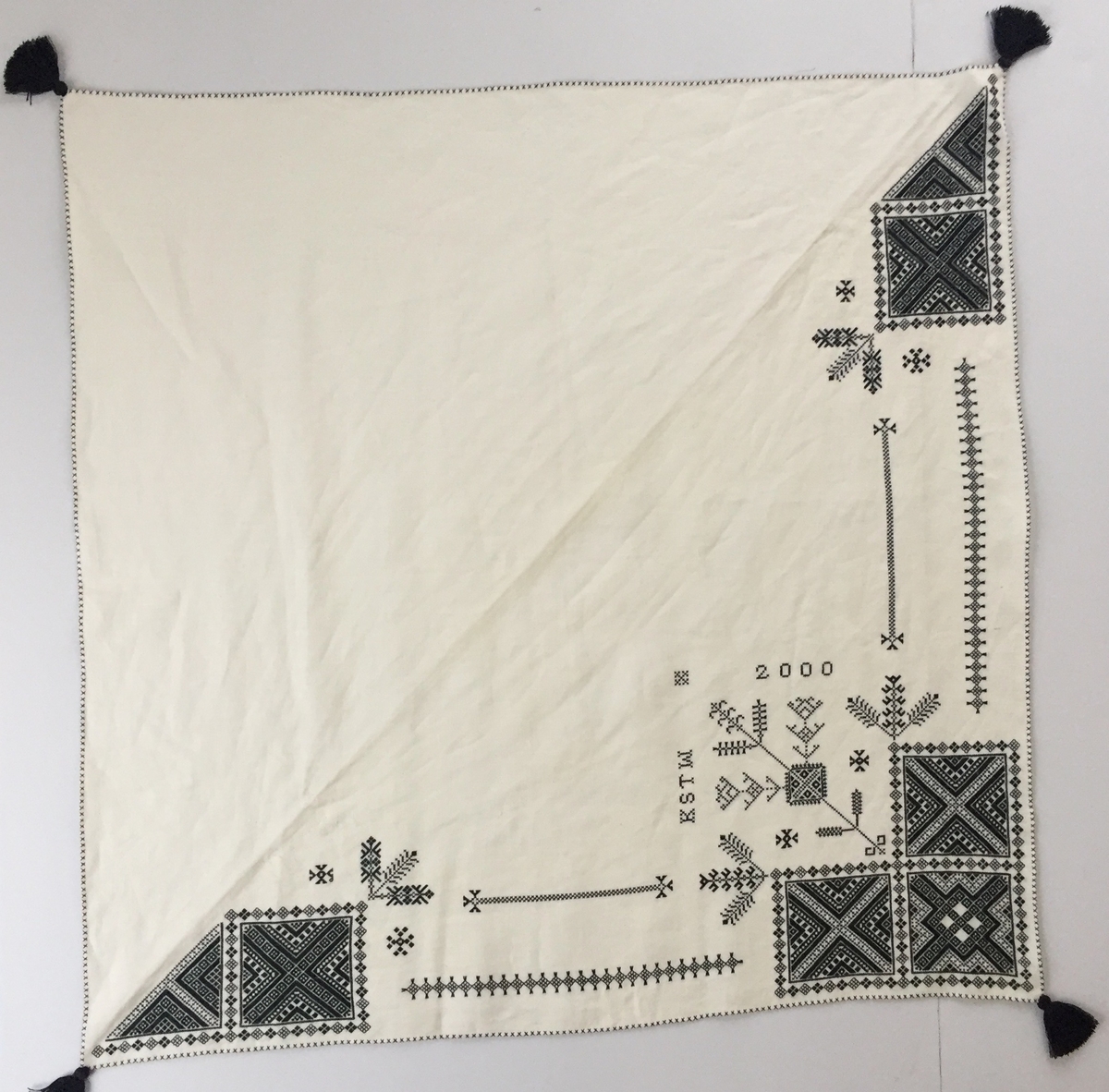 Geometriskt mönster i kvadrater i hörnen. Två bårder mellan kvadraterna på ryggsnibb och framsnibbar. På ryggsnibben tre kvadrater och en majstångsspira samt märkning med årtal och initialer. På varje framsnibb en kvadrat och en trekant. Sju ornament.