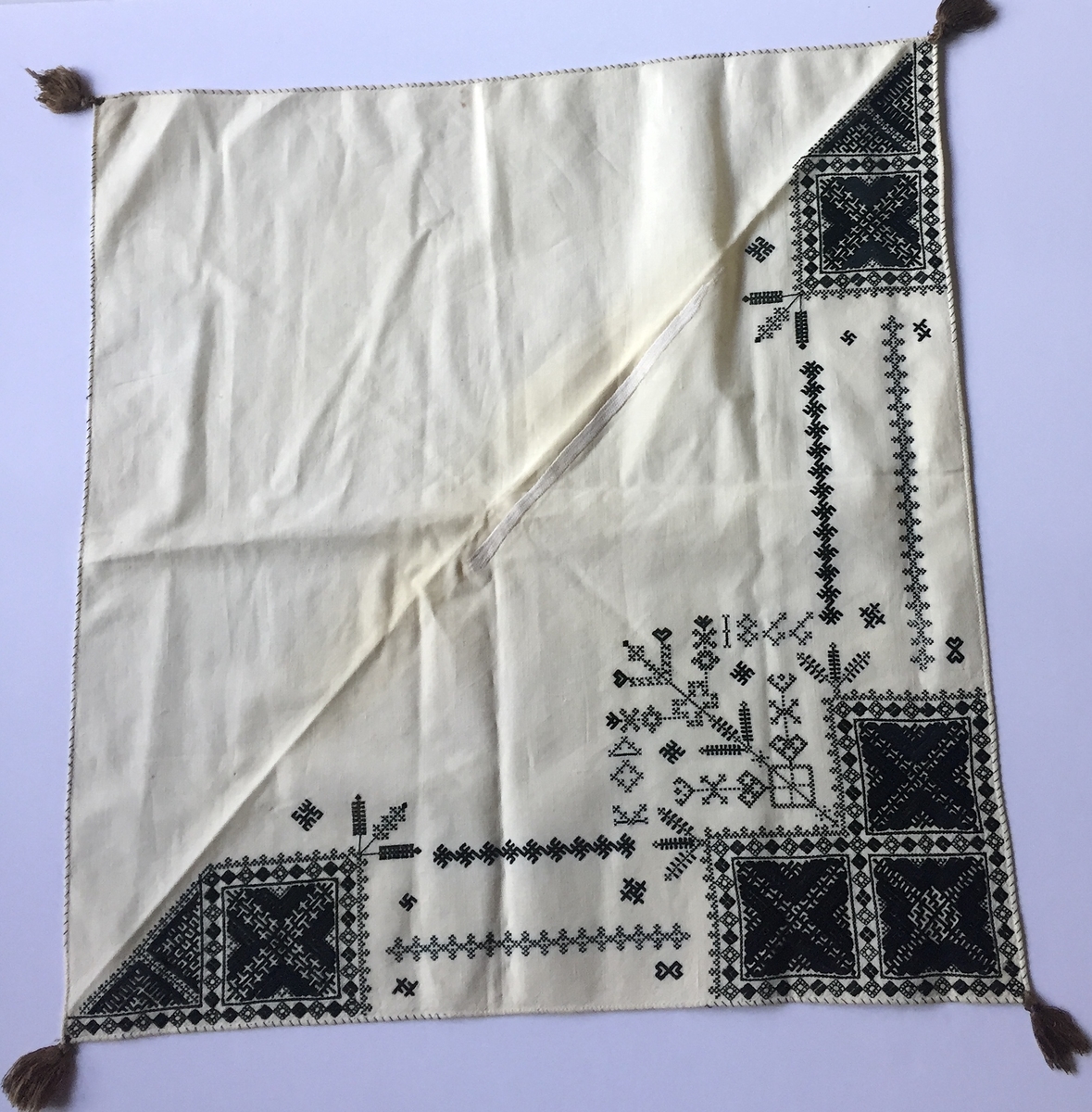 Geometriskt mönster i kvadrater i hörnen, två bårder mellan kvadraterna på ryggsnibb och framsnibbar. På ryggsnibben tre kvadrater och en majstångsspira samt märkning med årtal och initialer. På varje framsnibb en kvadrat och en trekant. Tolv ornament.