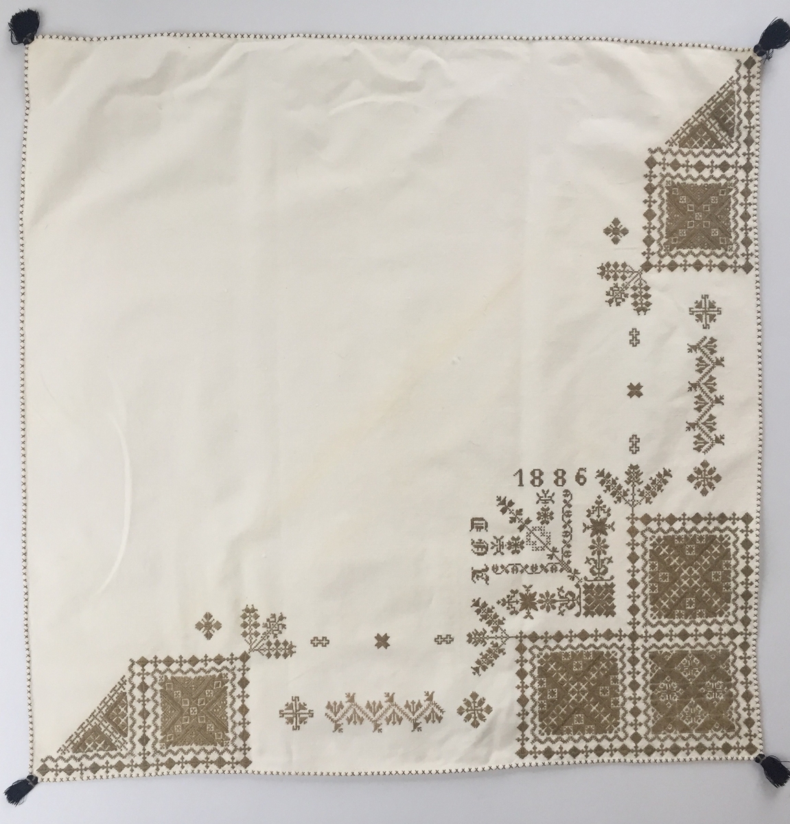Blomsterinspirerat mönster i kvadrater i hörnen .En bård med blomsterliknande mönster mellan kvadraterna på ryggsnibb och framsnibbar. På ryggsnibben tre kvadrater och en rikt dekorerad majstångsspira samt märkning med årtal och initialer. På varje framsnibb en kvadrat och en trekant. Tolv ornament.