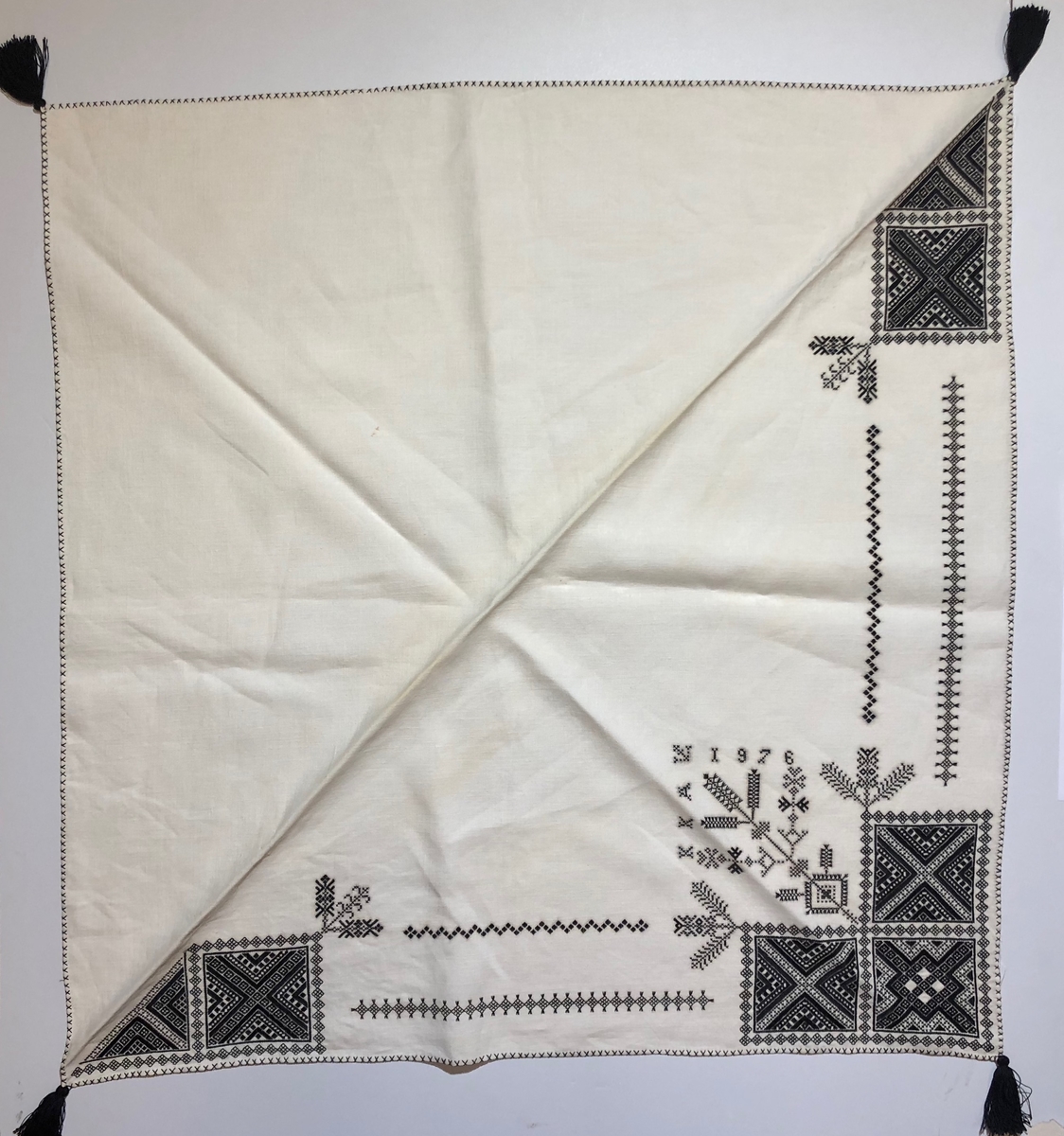 Geometriskt mönster i kvadrater i hörnen. Två bårder mellan kvadraterna på ryggsnibb och framsnibbar. På ryggsnibben tre kvadrater och en majstångsspira samt märkning med årtal och initialer. På varje framsnibb en kvadrat och en trekant. Ett ornament