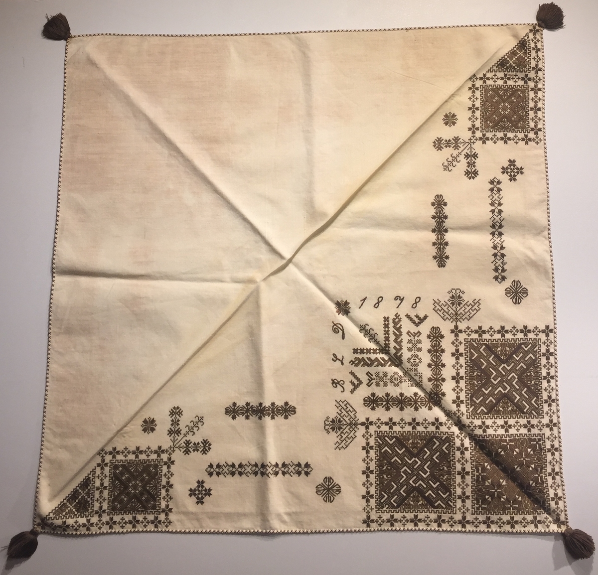 Geometriskt mönster med blomsterliknande motiv i kvadrater i hörnen, två bårder mellan kvadraterna på ryggsnibb och framsnibbar. På ryggsnibben tre kvadrater och en rikt dekorerad majstångsspira samt märkning med årtal och initialer. På varje framsnibb en kvadrat och en trekant. Sex ornament.