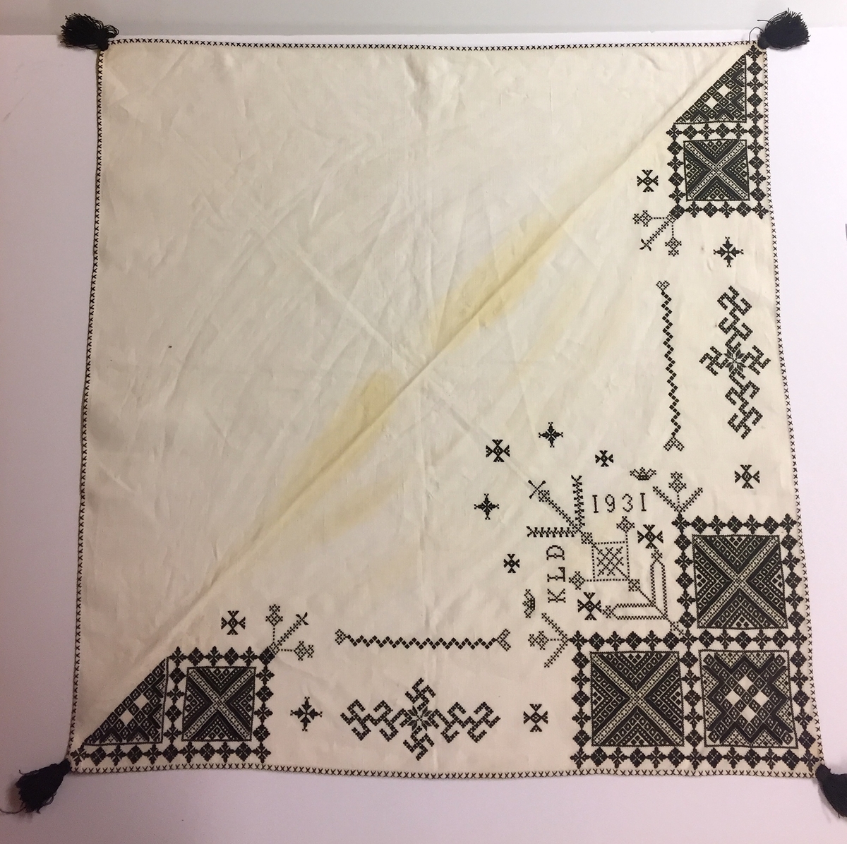 Geometriskt mönster i kvadrater i hörnen, två bårder mellan kvadraterna på ryggsnibb och framsnibbar. Den ena i svastikaliknande former. På ryggsnibben tre kvadrater och en stor majstångsspira samt märkning med årtal och initialer. På varje framsnibb en kvadrat och en trekant. Femton ornament.