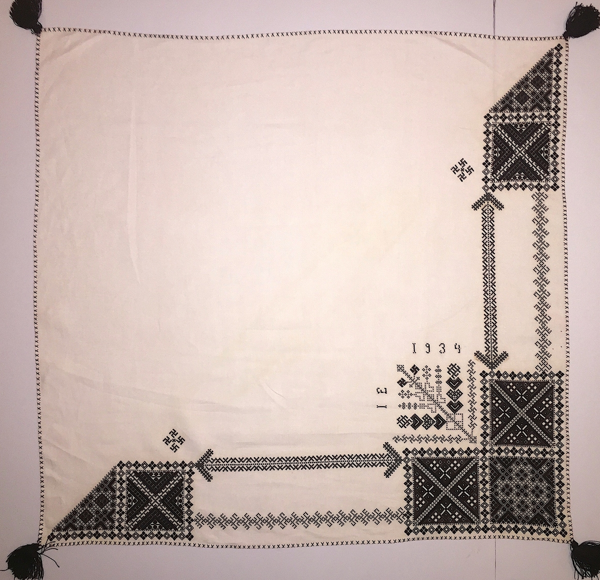 Geometriskt mönster i kvadrater i hörnen, huvudsakligen i rätlinjig plattsöm. Två bårder mellan kvadraterna på ryggsnibb och framsnibbar. På ryggsnibben tre kvadrater och en fyrkantig majstångsspira . På varje framsnibb en kvadrat och en trekant. Två ortnament.