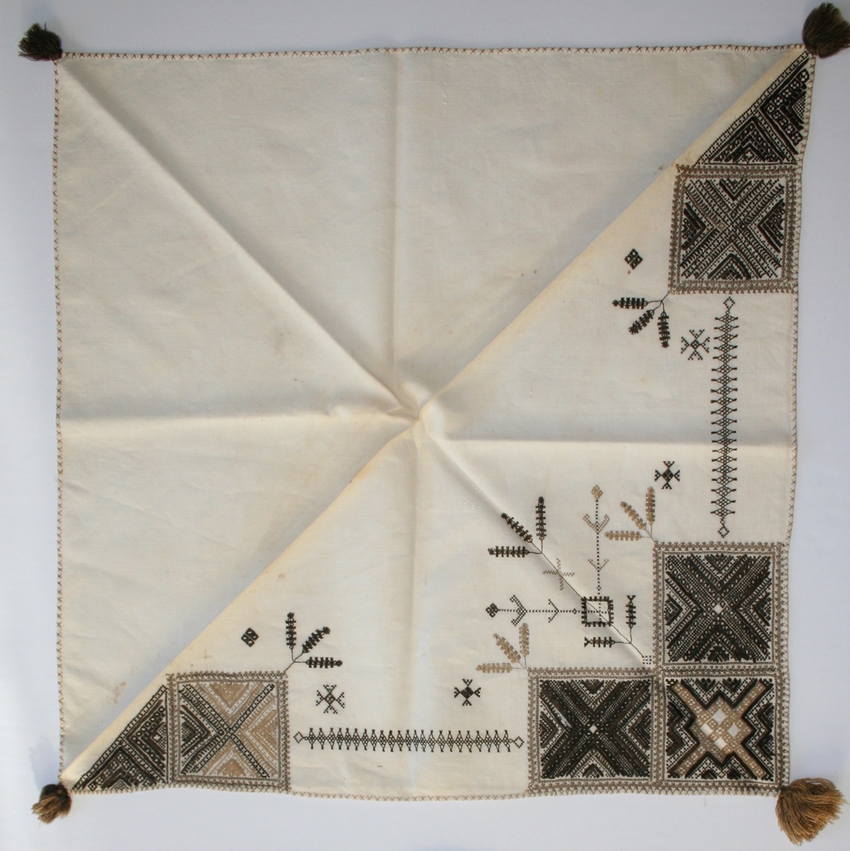 Geometriskt mönster i kvadrater i hörnen, en bård mellan kvadraterna på ryggsnibb och framsnibbar. På ryggsnibben tre kvadrater och en majstångsspira. På varje framsnibb en kvadrat och en trekant. Sex ornament.
