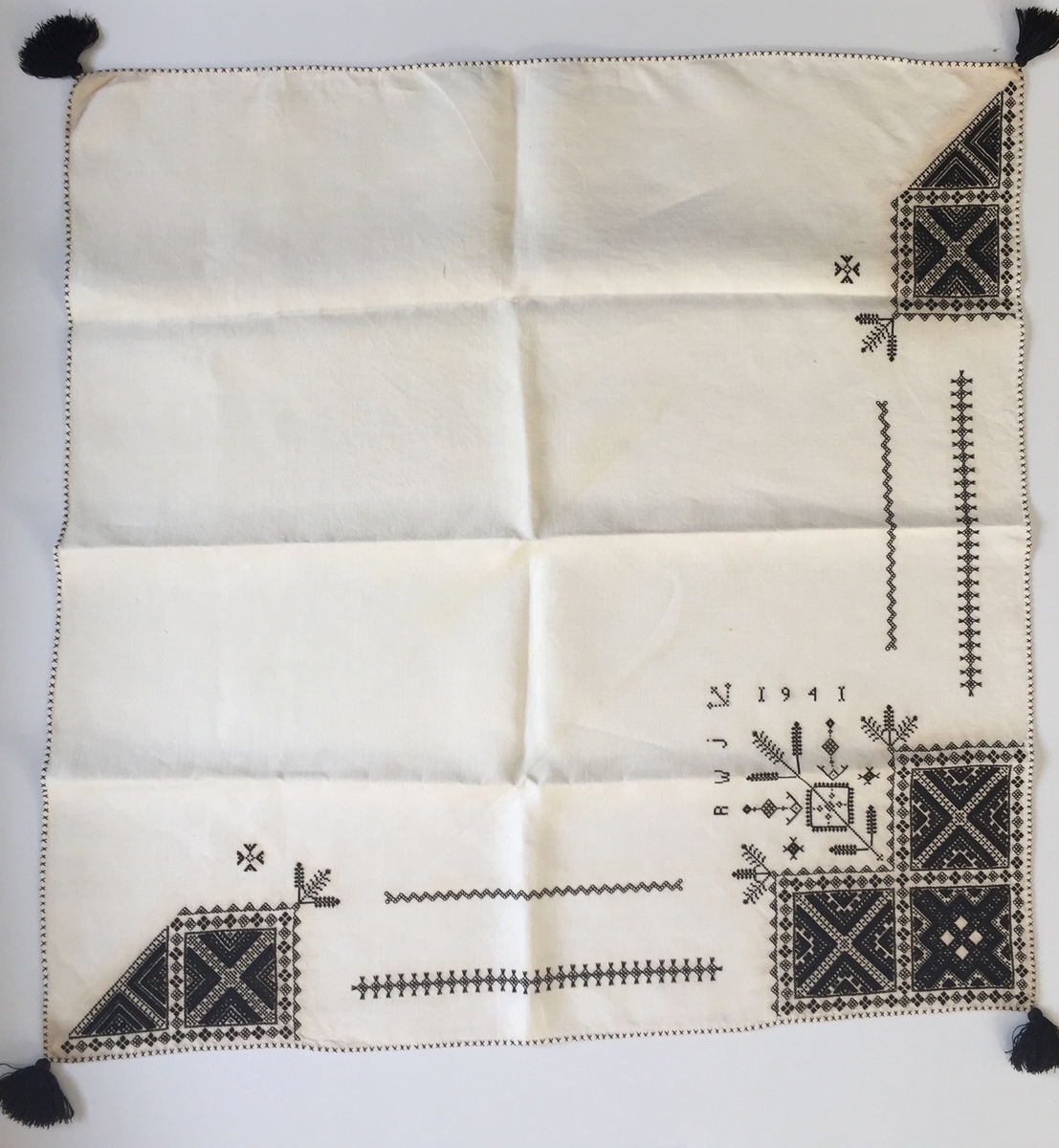 Geometriskt mönster i kvadrater i hörnen två bårder mellan kvadraterna på ryggsnibb och framsnibbar. På ryggsnibben tre kvadrater och en majstångsspira samt märkning med årtal och initialer. På varje framsnibb en kvadrat och en trekant. Fem ornament.